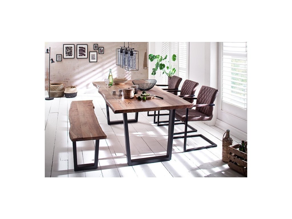 Jídelní lavice ze dřeva akácie ve 3 barevných provedeních - akácie šedá, akácie ořech (tmavší odstín) a akácie natur (bledší odstín) s podnoží trapez antik - lichoběžník, antické provedení - "ošumělý design". Deska lavice má na delší straně nádherný autentický stromový okraj.Lavice je vyhotovena v různých rozměrech, stejně je možné lavici nakombinovat s 3 různými podnožemi, kde každá ma 3 barevná provedení. Jednotlivé varianty podnoží najdete na naší stránce u stolů Calabria.