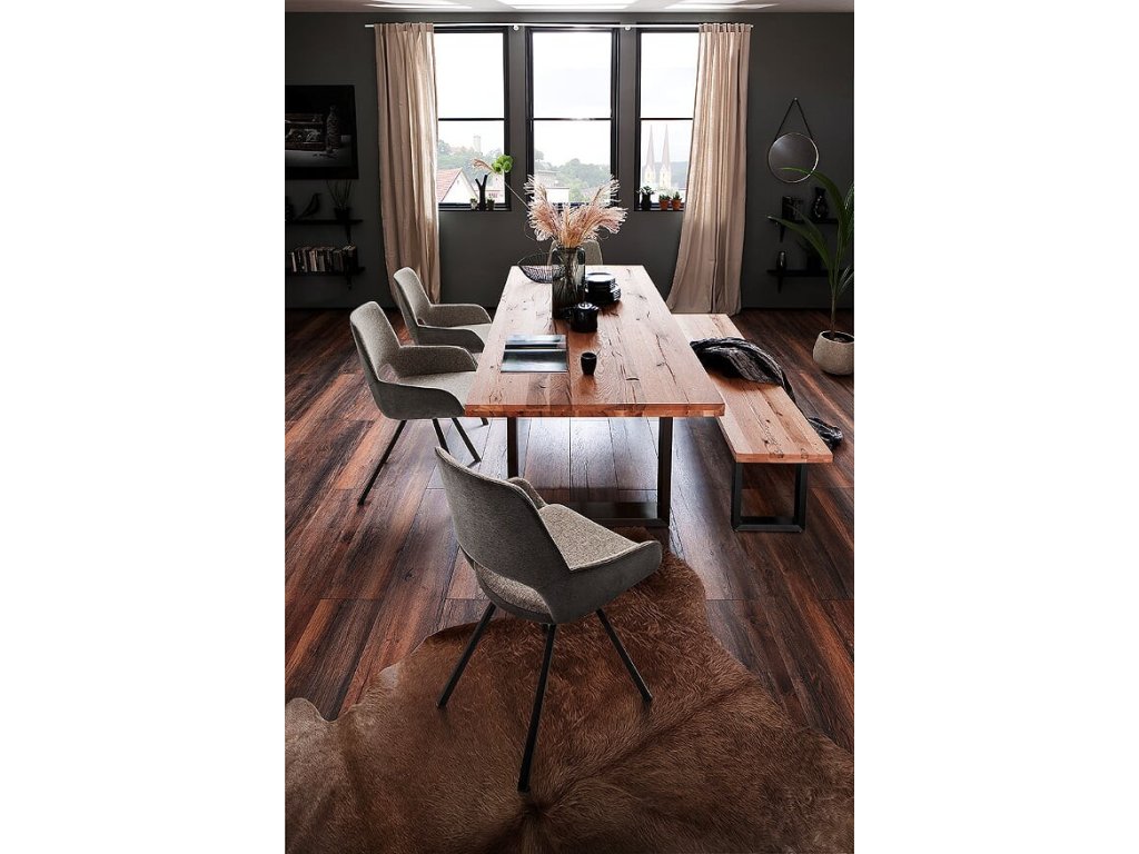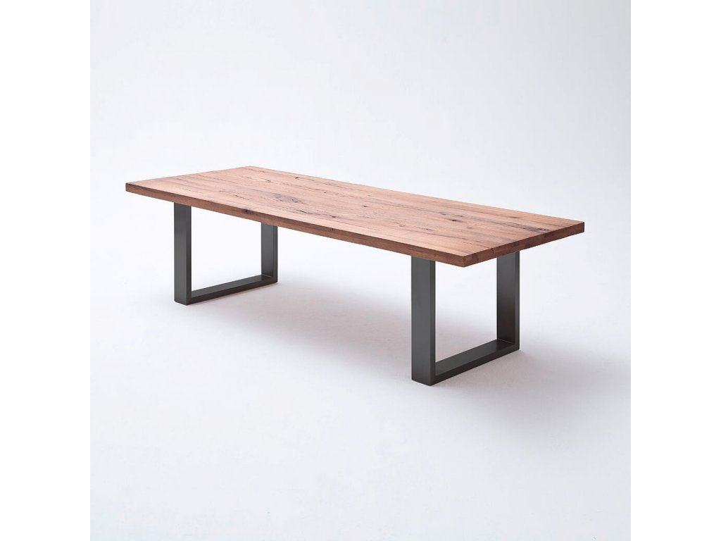 Na jídelním stole Castello vás neupoutá jen jeho surový masivní vzhled. I tento stůl patří jako například stůl Matras mezi jedinečné unikáty. Čtyři druhy stromů, čtyři různá provedení. Každý ze stromů, které byly použity při výrobě roste v jiných klimatických podmínkách, což se odráží na jedinečné barevnosti, vzoru, zakřivení a trhlinách. Jednoduše ORIGINÁL. Masivní dubové desce stolu o tloušťce 6 cm poskytuje pevnou podporu dvojice podnoží ve tvaru písmene U z nerezové oceli.