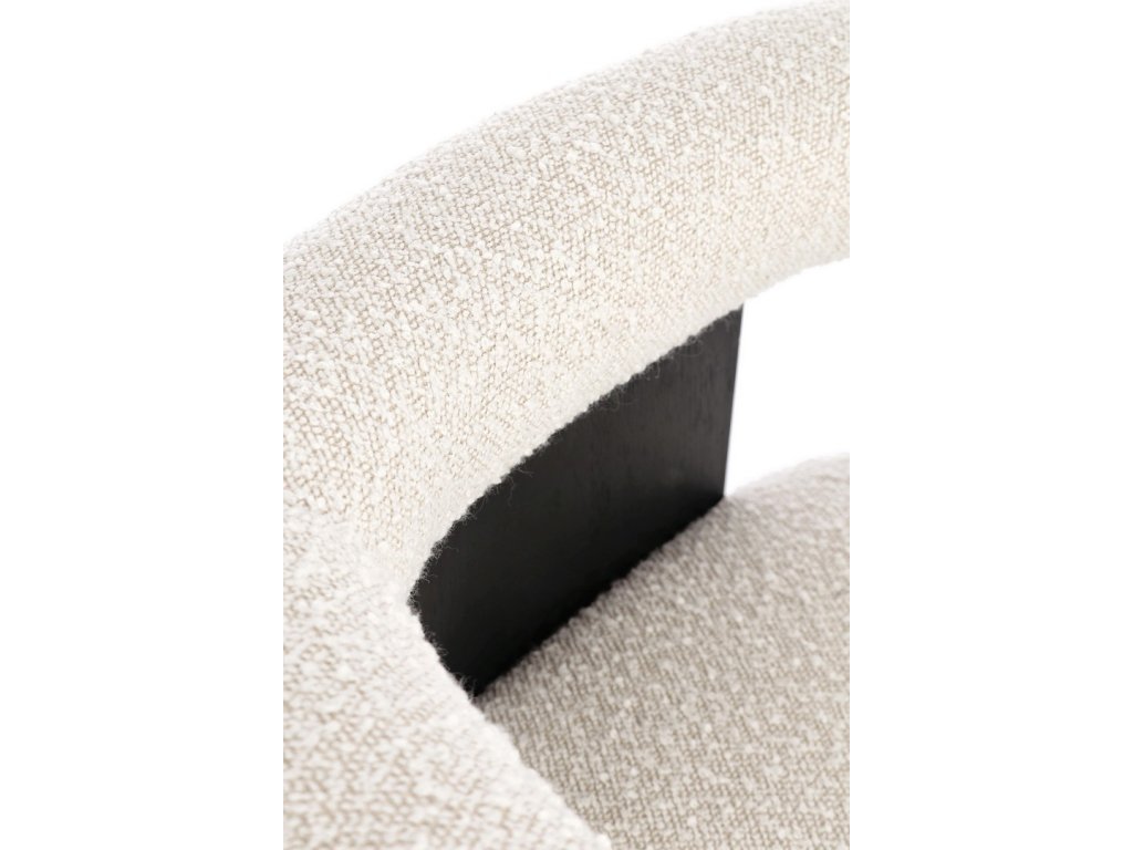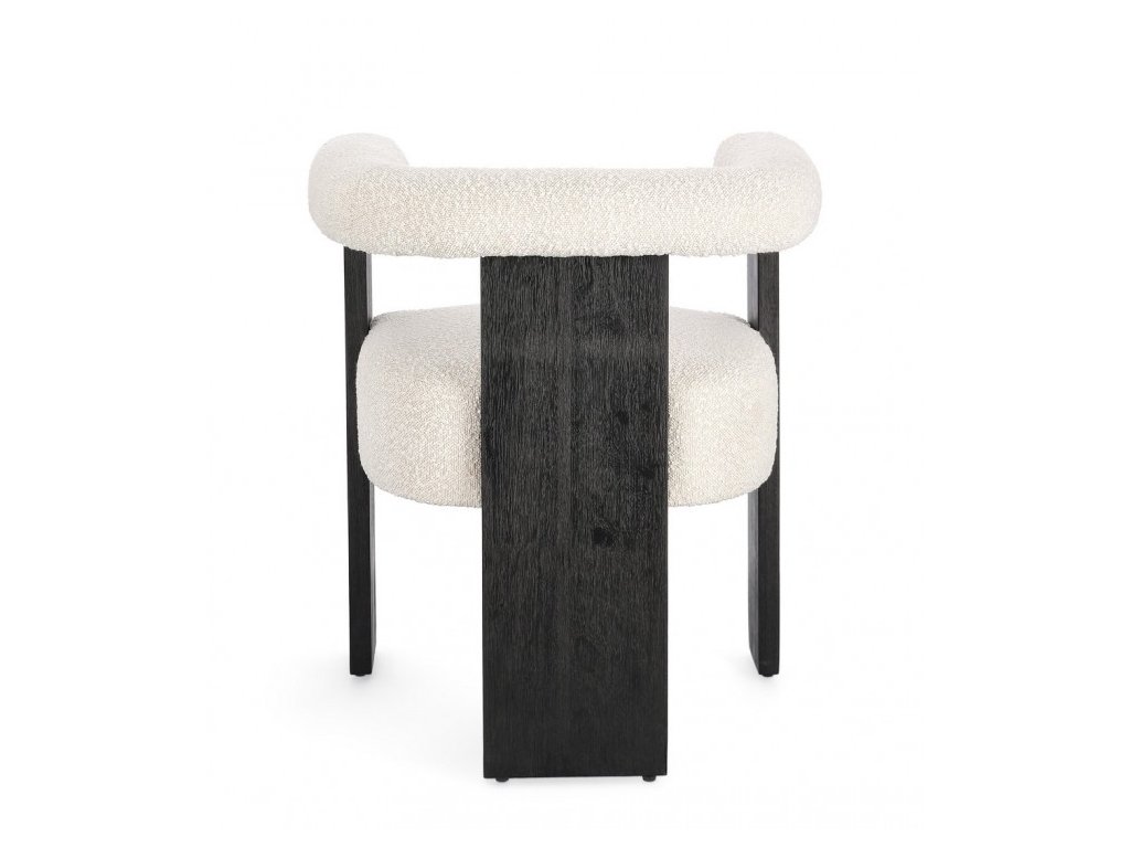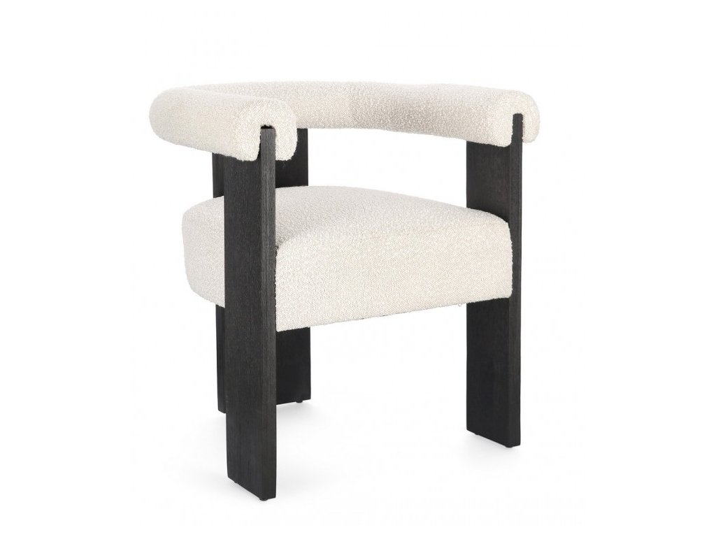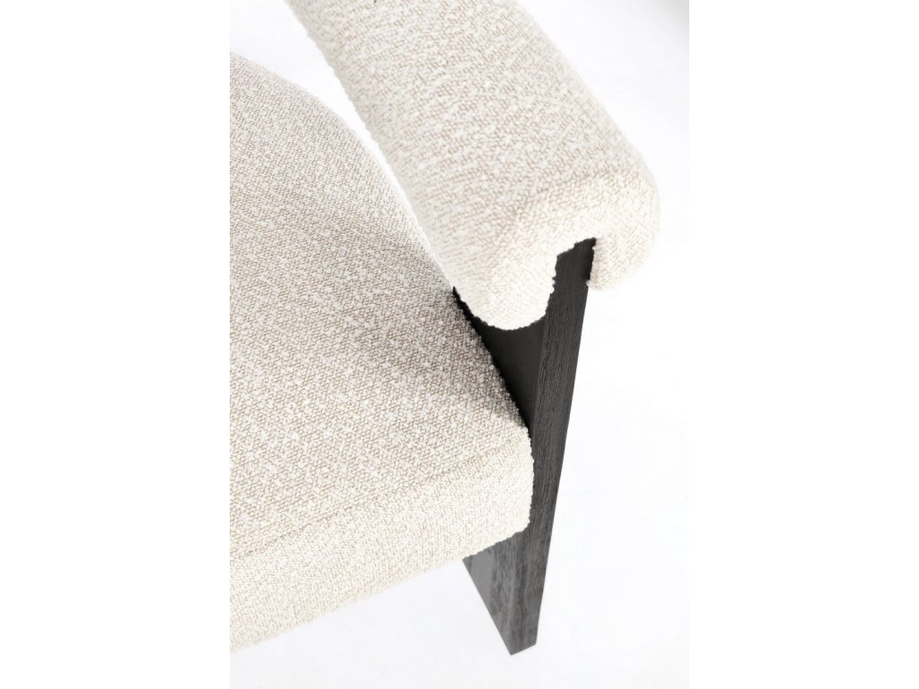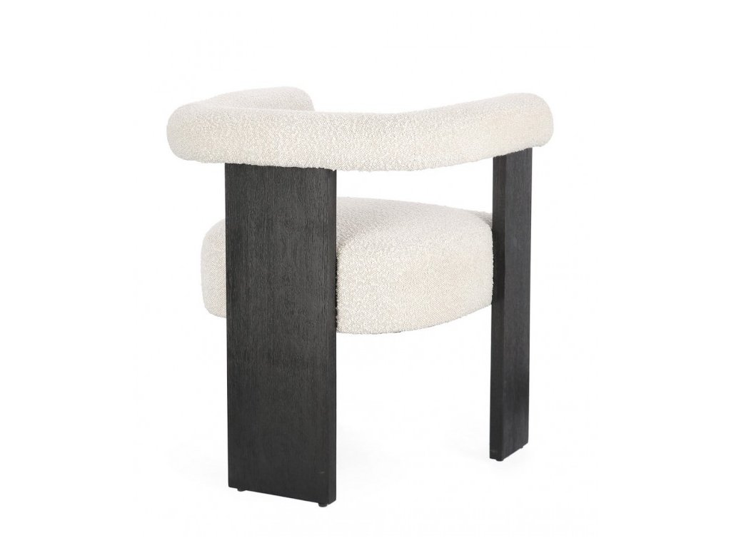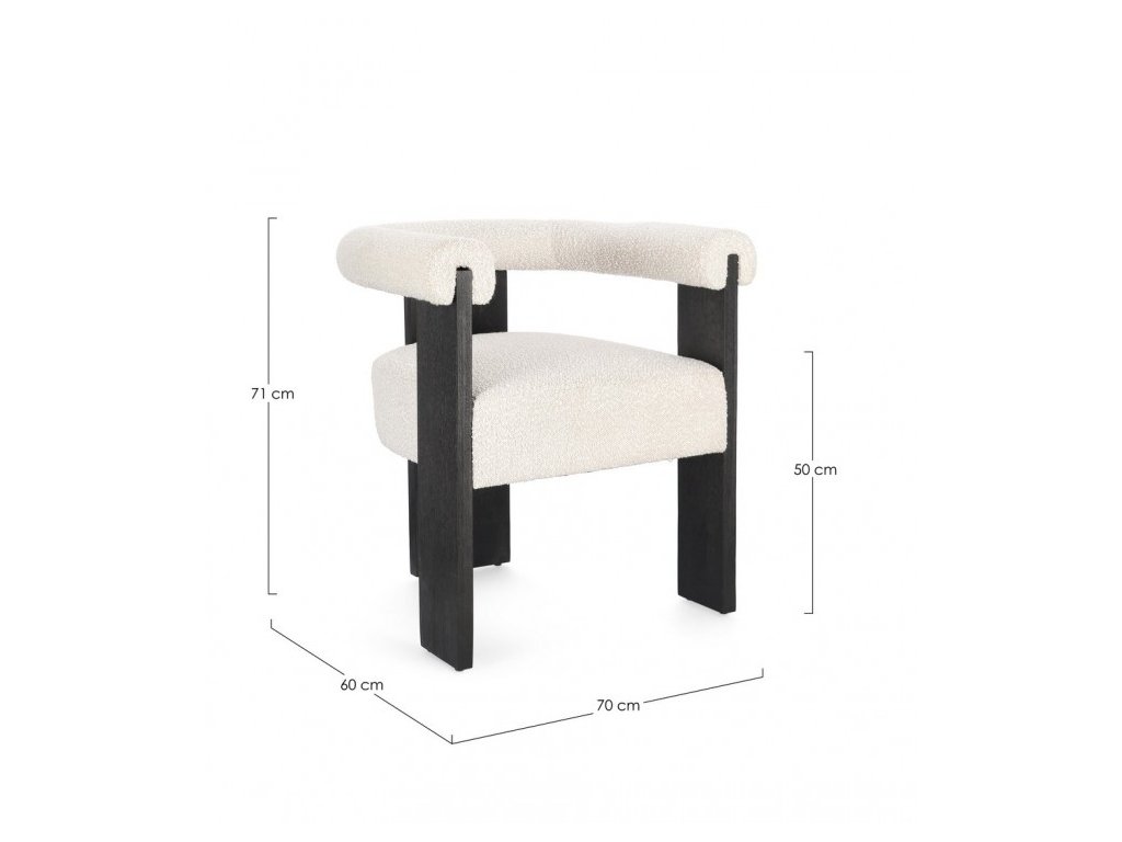 Jídelní židle s boucle efektem a loketní opěrkou. Rám židle je z borového dřeva, nohy židle tvoří gumovníkové dřevo. Moderní židle se hodí do kuchyně, jídelny či jako křeslo do vstupní chodby. Hustota náplně polyuretanovou pěnou 18/30 kg/m3.