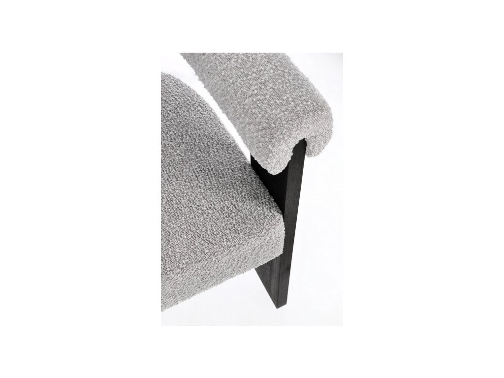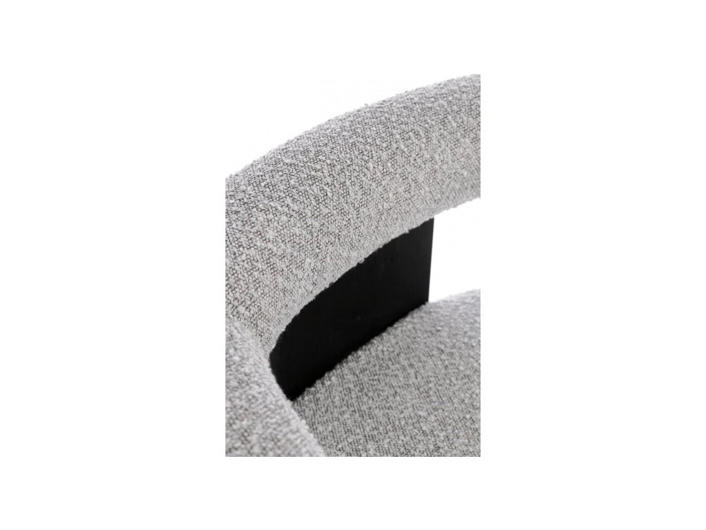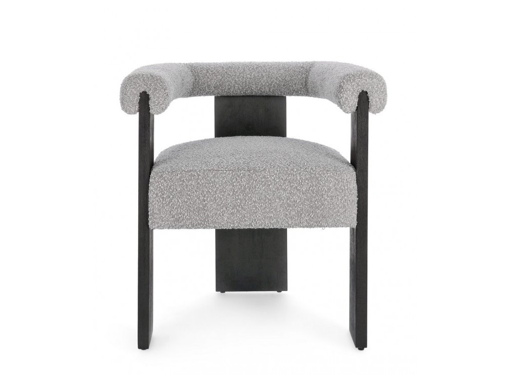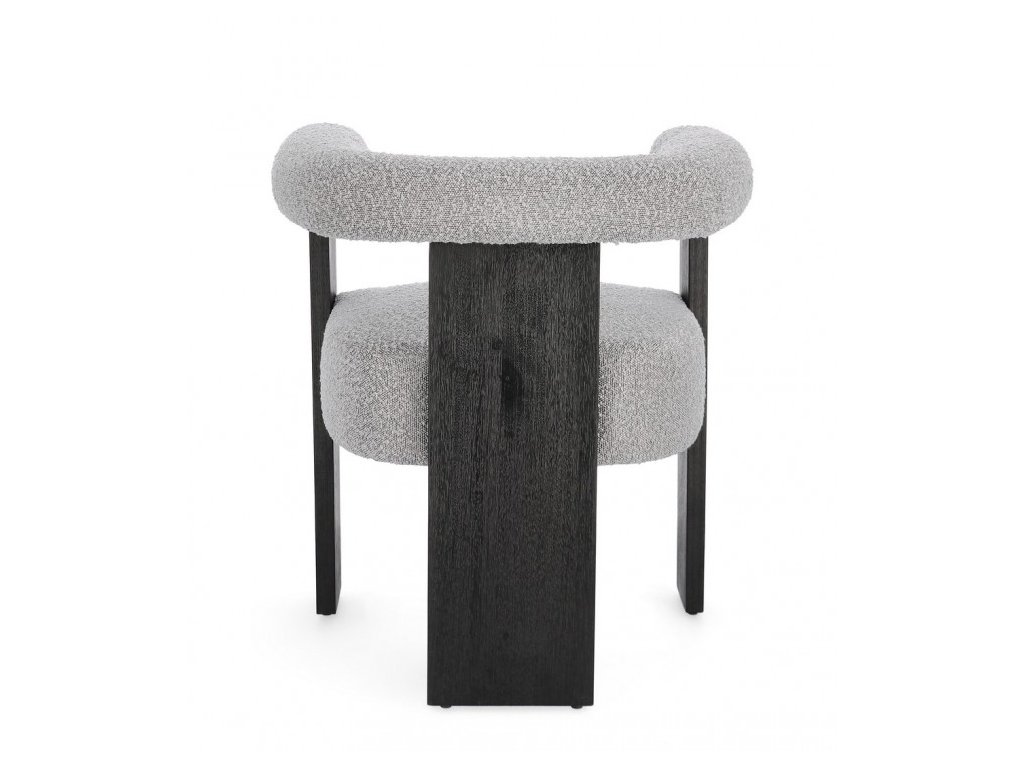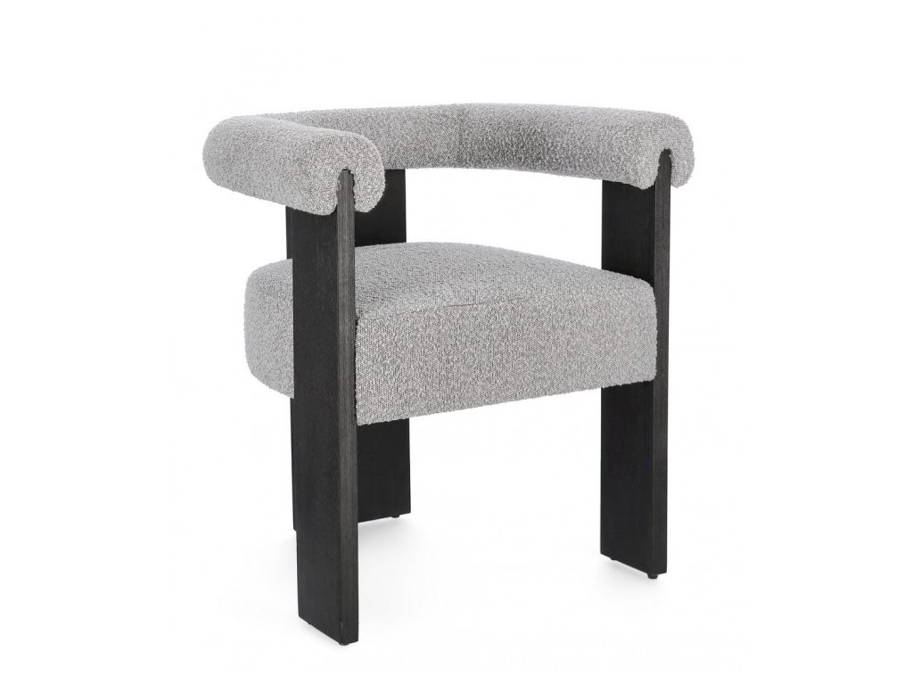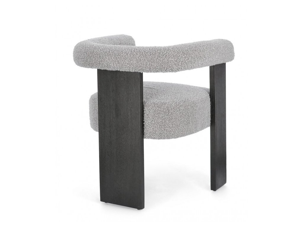 Moderní jídelní židle s boucle efektem a loketní opěrkou. Rám židle je z borového dřeva, nohy židle tvoří gumovníkové dřevo. Moderní židle se hodí do kuchyně, jídelny či jako křeslo do vstupní chodby. Hustota náplně polyuretanovou pěnou 18/30 kg/m3.