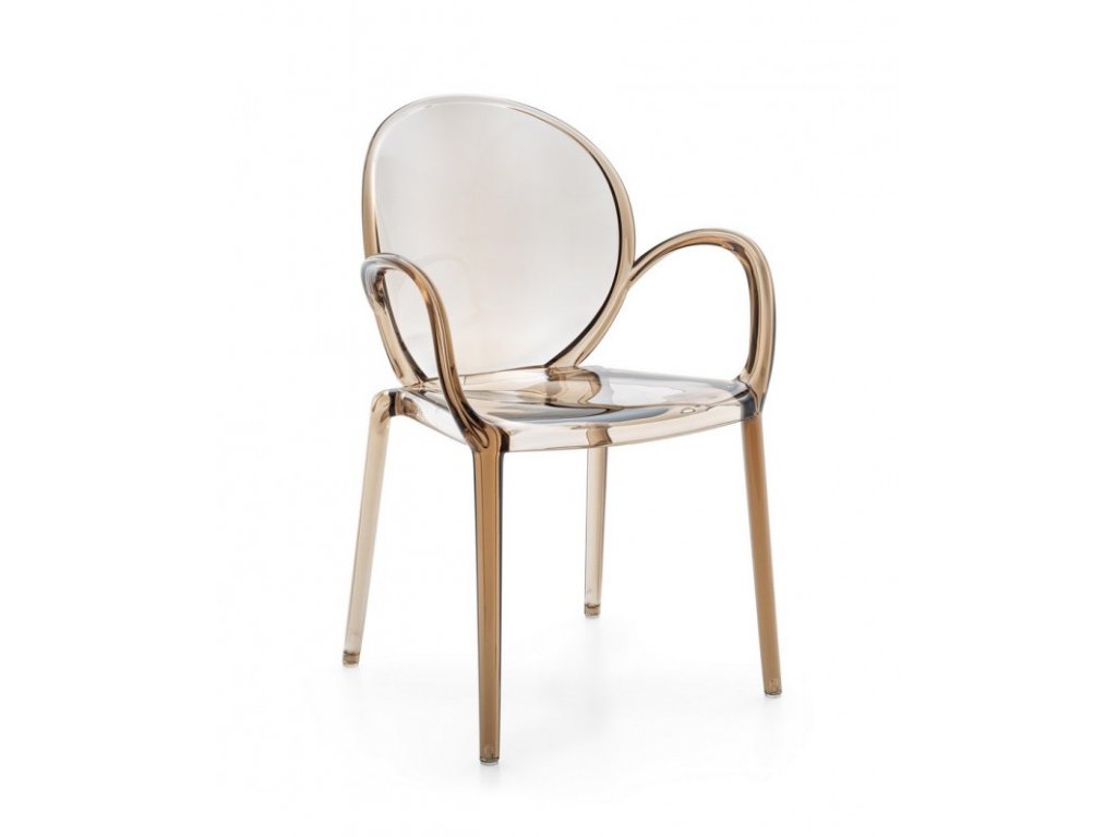 Moderní jídelní židle v kávové barvě s područkami do obývacího pokoje, jídelny či kuchyně. Polykarbonátová struktura s transparentní úpravou. Vhodná pro vnitřní i venkovní použití. Je stohovatelná.