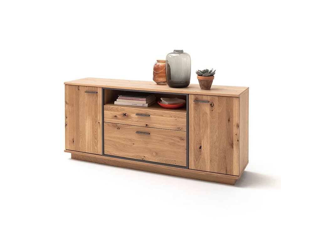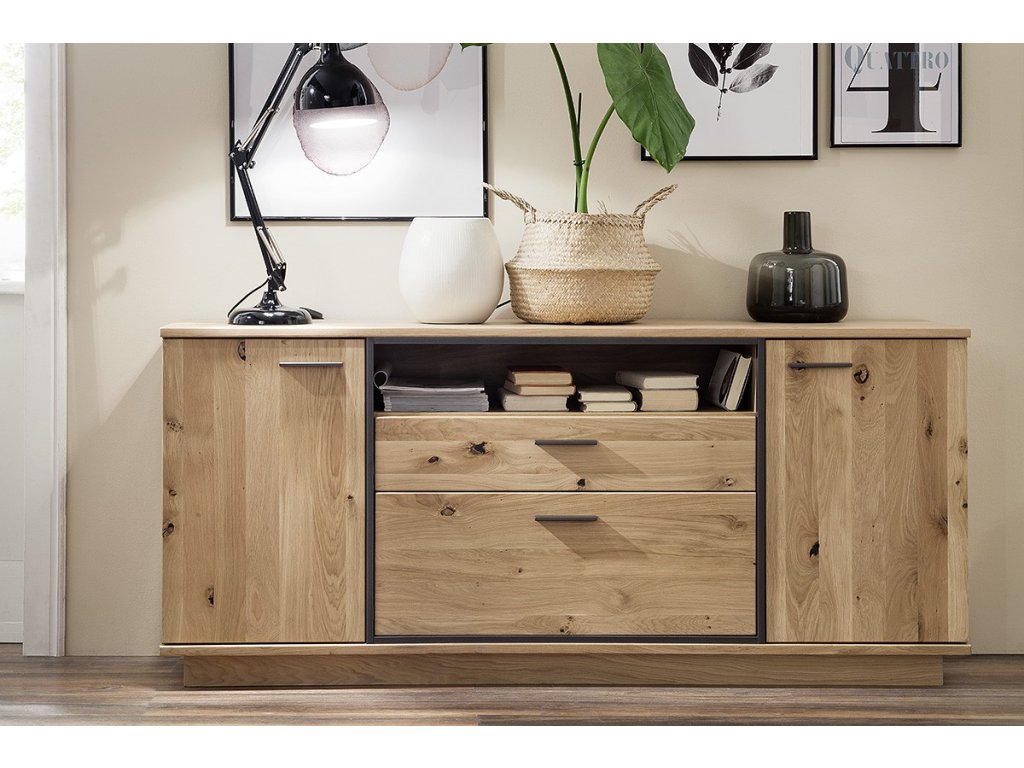 Designová komoda z dubu bianco a kovovou antracitovou konstrukcí. Komoda nabízí dvě zásuvky, dvě skříňky a polici jako úložný prostor. V nabídce se nacházejí i další kousky z této kolekce, stačí do vyhledávání zadat "CAMPINAS" pro jejich zobrazení.