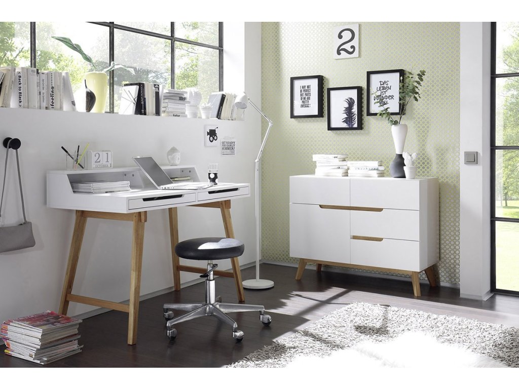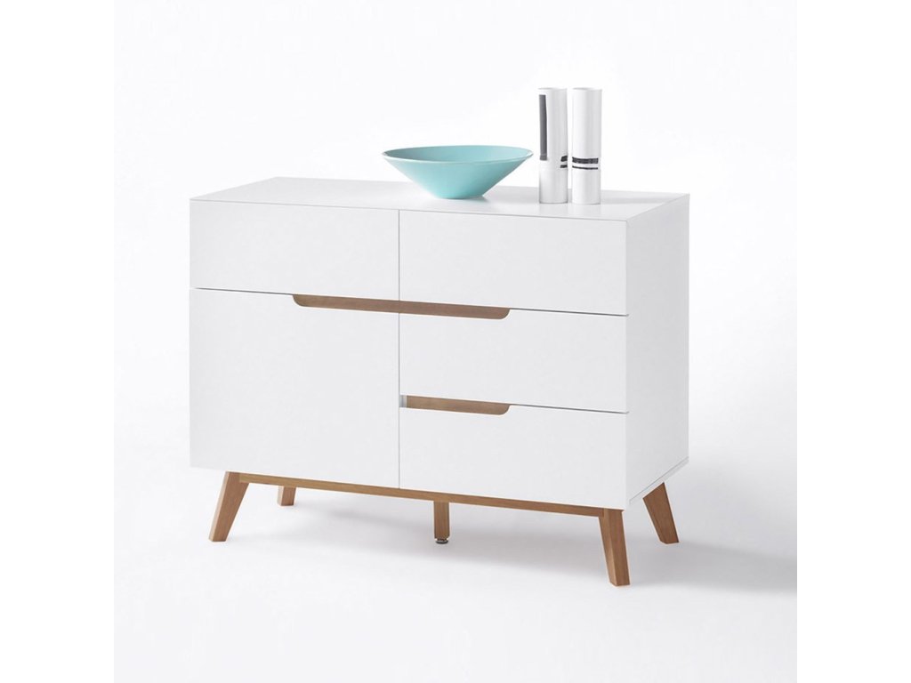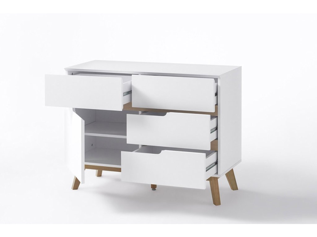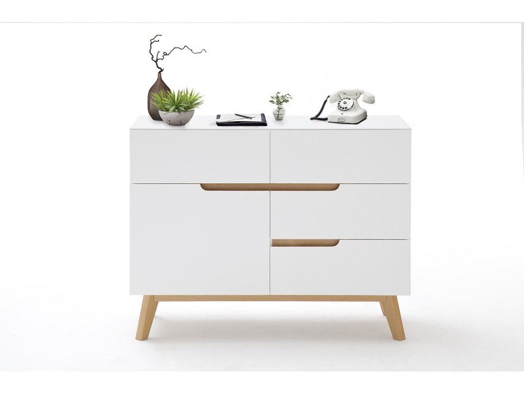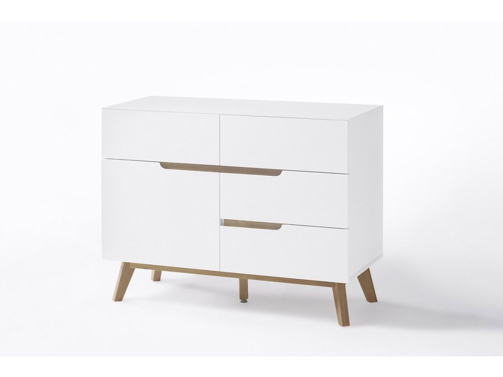 Designová komoda s čistým bílým designem obohaceným o prvky z dubového dřeva. Komoda disponuje úložným prostorem v provedení 4 zásuvky a 1 dvířka. V nabídce se nacházejí i další kousky z této kolekce, stačí do vyhledávání zadat "CERVO" pro jejich zobrazení.