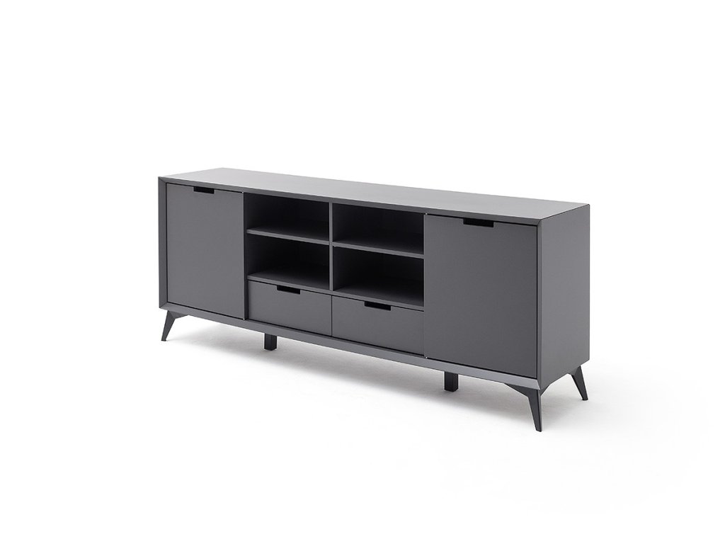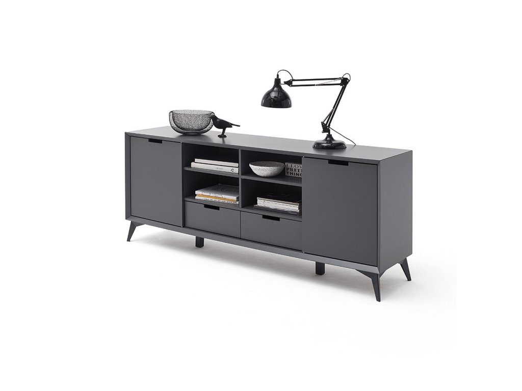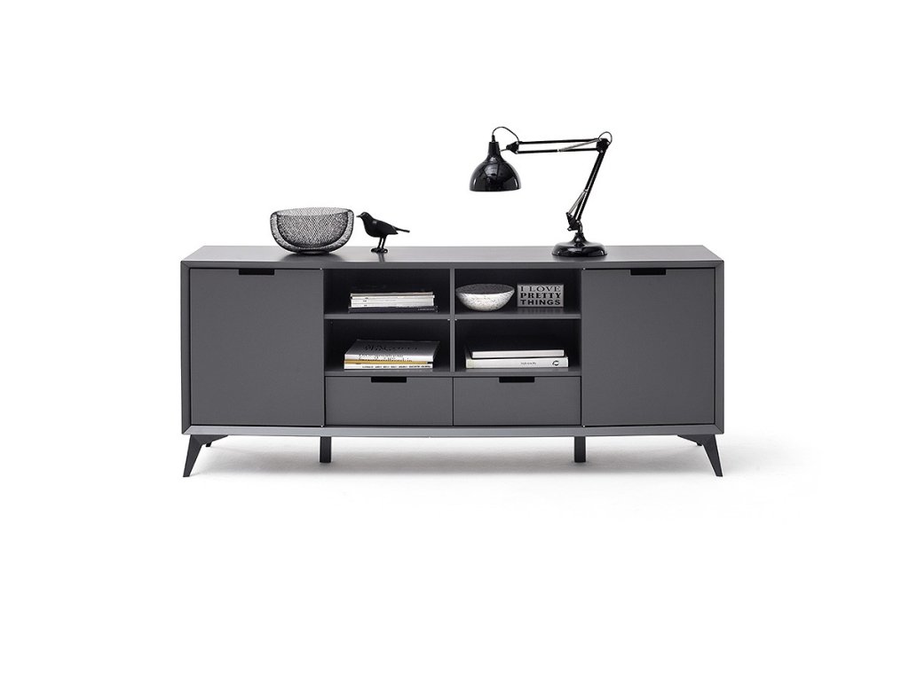 Nadčasová komoda v jedinečném designu, který se hlavně vyznačuje kombinací barev šedé a bílé. Komoda stojí na vyvýšených nohách, což umožňuje dobrý přístup pod komodu. Komoda disponuje skříňkami a zásuvkami.
