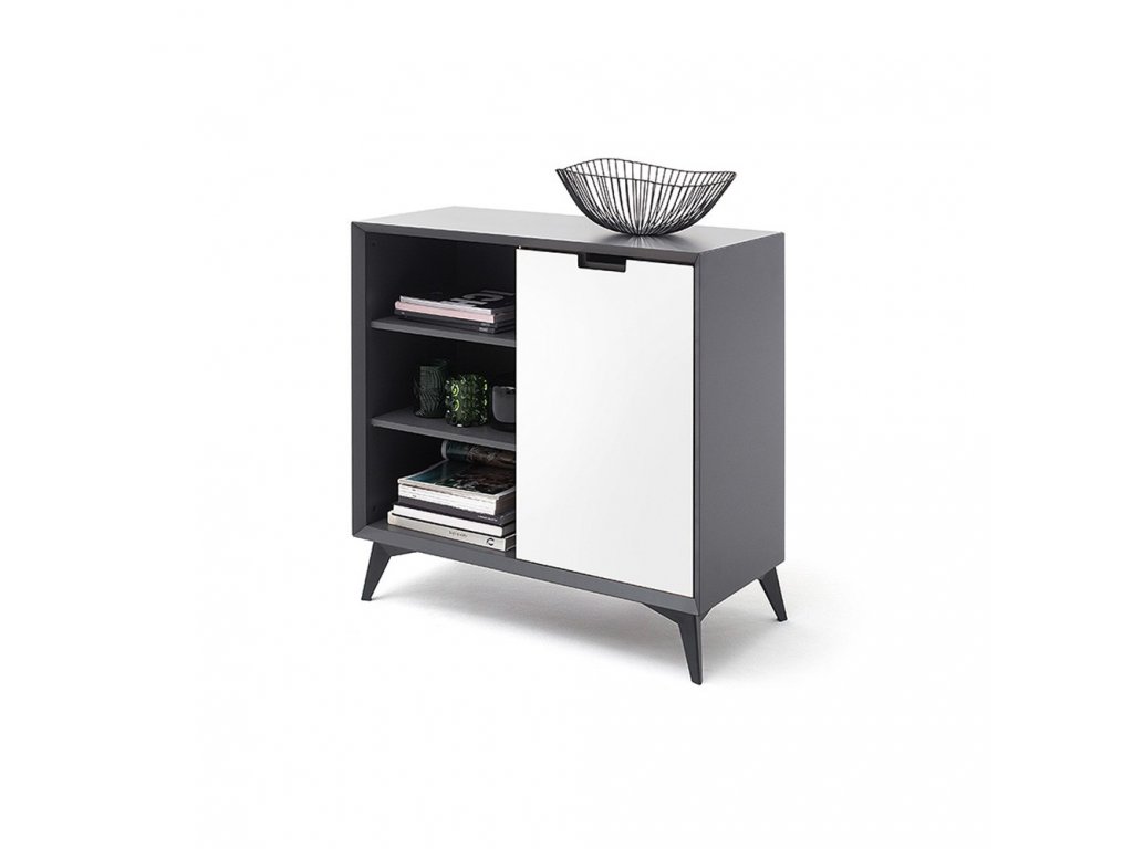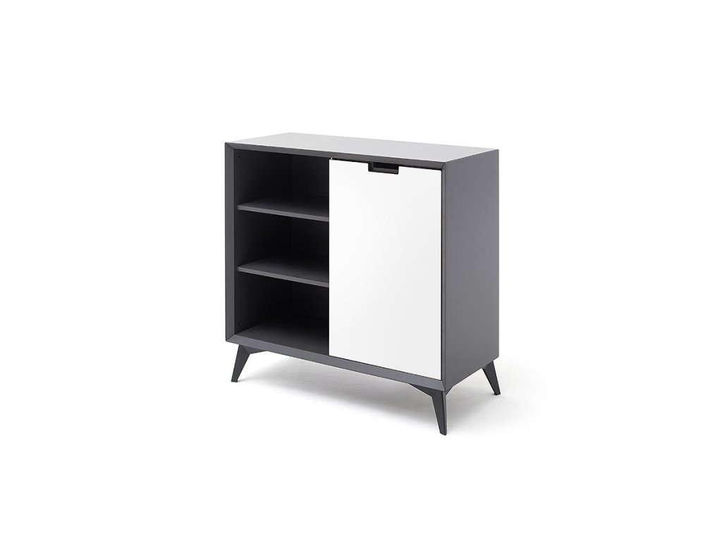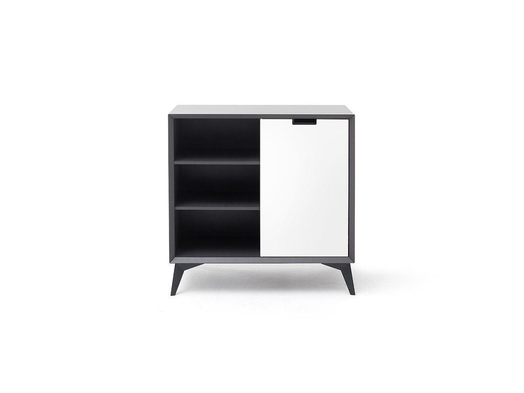 Nadčasová komoda v jedinečném designu, který se hlavně vyznačuje kombinací barev šedé a bílé. Komoda stojí na vyvýšených nohách, což umožňuje dobrý přístup pod komodu. Komoda disponuje skříňkami a zásuvkami.