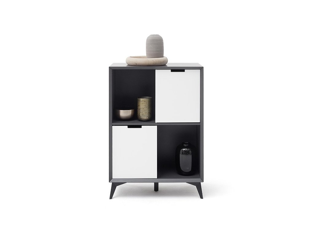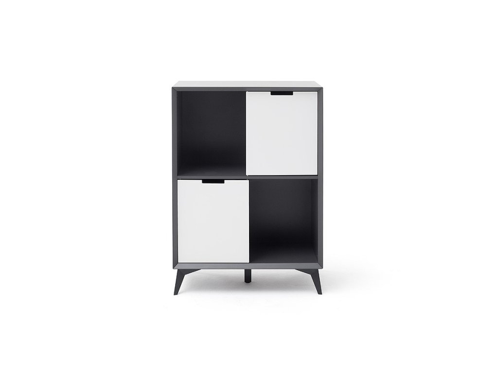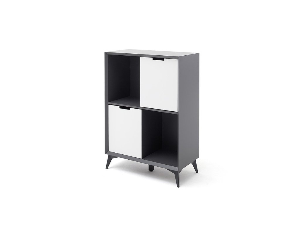 Nadčasová komoda v jedinečném designu, který se hlavně vyznačuje kombinací barev šedé a bílé. Komoda stojí na vyvýšených nohách, což umožňuje dobrý přístup pod komodu. Komoda disponuje skříňkami a zásuvkami.