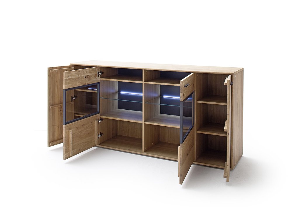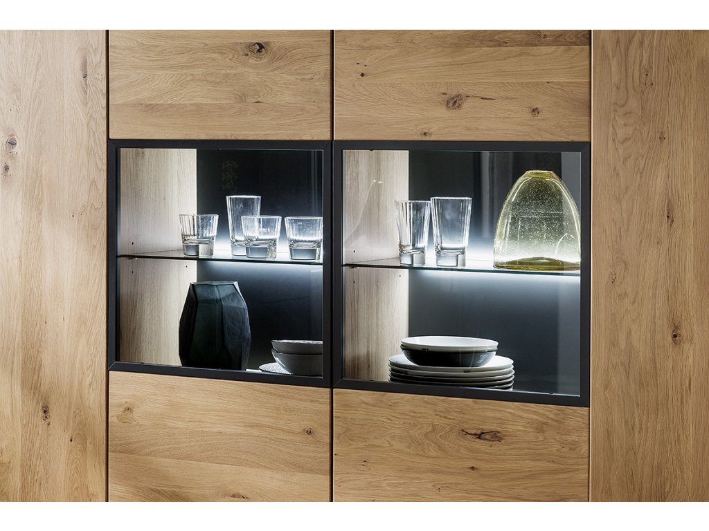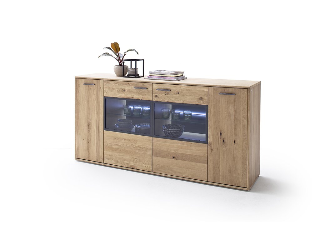 Designová komoda v provedení dub Bianco v kombinaci s antracytovými prvky a imitací dubového dekoru. Komoda disponuje úložným prostorem v podobě skříněk s dvířky, dvířky se sklem a volitelným LED podsvícením. V nabídce se nacházejí i další kousky z této kolekce, stačí do vyhledávání zadat "PORTLAND" pro jejich zobrazení.