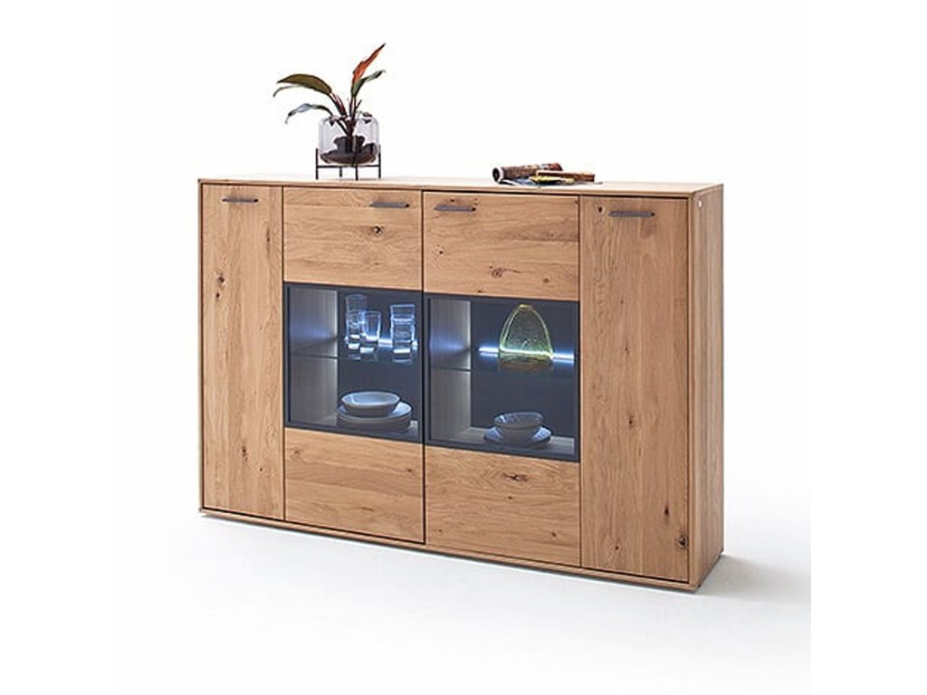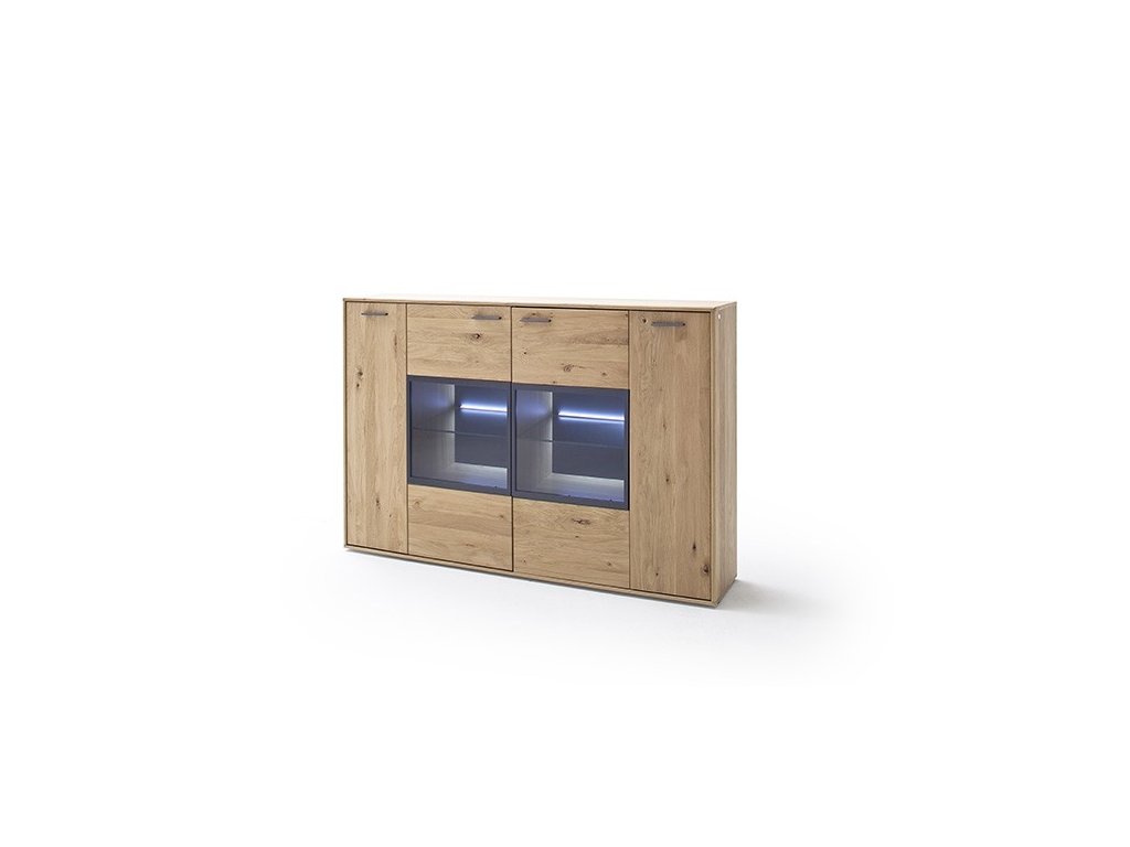 Designová komoda v provedení dub Bianco v kombinaci s antracitovými prvky a imitací dubového dekoru. Komoda disponuje úložným prostorem v podobě skříněk s dvířky, dvířky se sklem a volitelným LED podsvícením. V nabídce se nacházejí i další kousky z této kolekce, stačí do vyhledávání zadat "PORTLAND" pro jejich zobrazení.