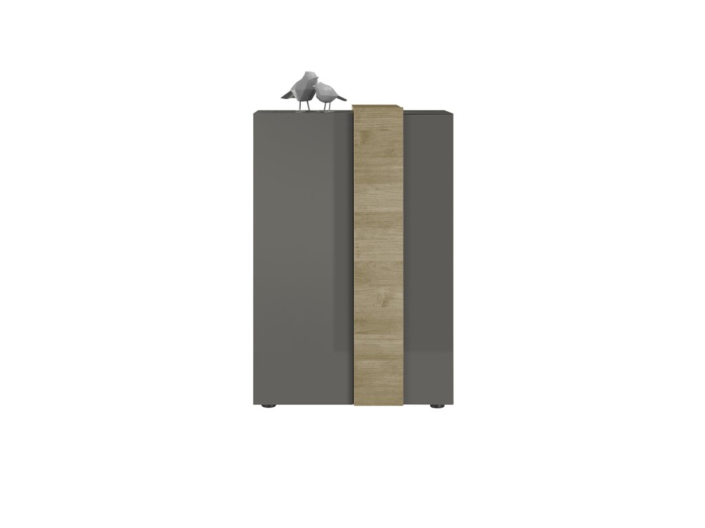 Prostorná a vysoká komoda Positiano III je poutavým kouskem. Poznávacím znakem nábytku z kolekce Positiano je atraktivní provedení a prvek v povrchové úpravě dubu Mercure s výraznou strukturou dřeva. Za dvojicí velkých dvířek naleznete dostatek prostoru pro uložení důležitých dokumentů či drobností. Úložné prostory jsou předěleny poličkami. Užitečný mechanismus s tichým chodem je skutečnou povinnou výbavou modelové řady a zajišťuje šetrné a nehlučné zavírání dvířek. Korpus a přední části jsou vyrobeny z laminovaných MDF desek. Vysokolesklé provedení v antracitové barvě.