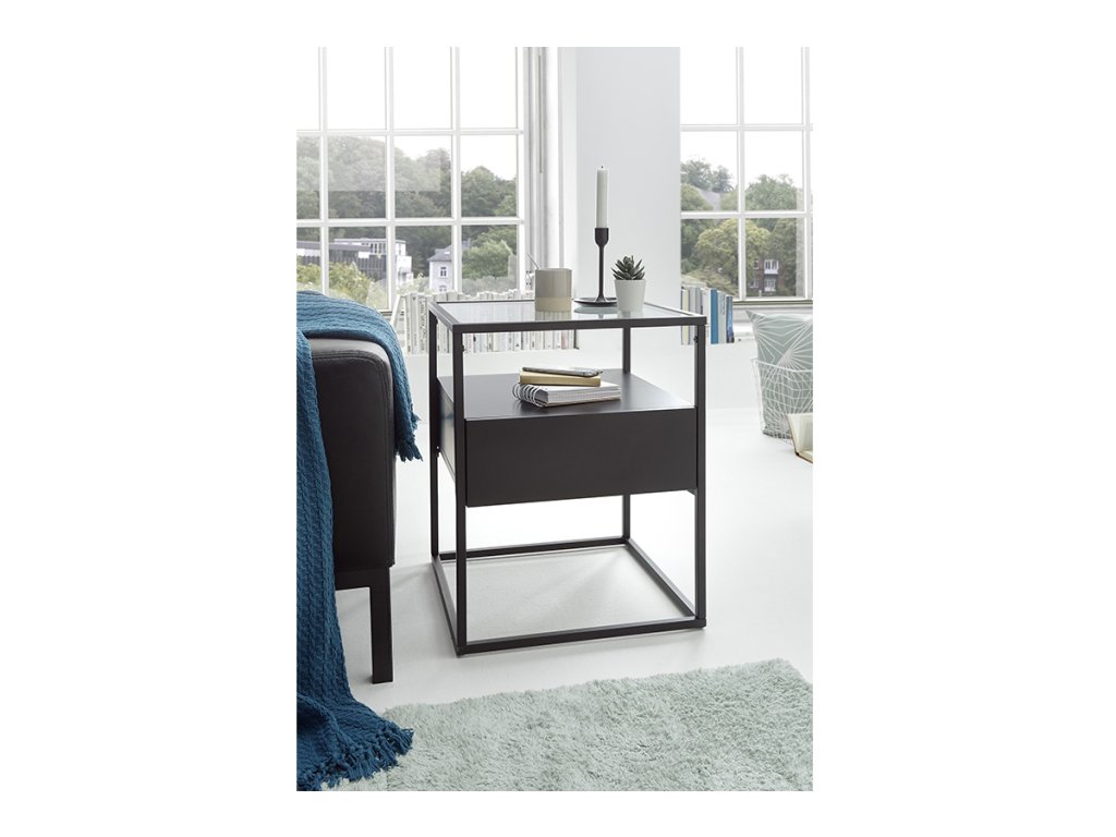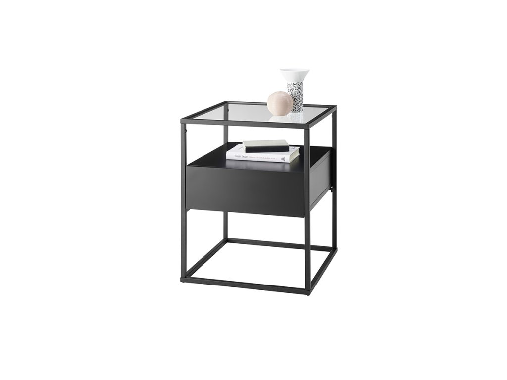 Čtvercový konferenční stolek se zásuvkou se vzhledem ke svým kompaktním rozměrům vyznačuje množstvím úložného prostoru. K uložení lze využít nejen samotnou zásuvku, ale také poličku nad ní. Pevná kovová podnož je pokryta černou práškovou barvou. Hlavní část se zásuvkou a poličkou se skládá z MDF desek pokrytých černou matnou fólií. Deska stolu je vyrobena z čirého skla.