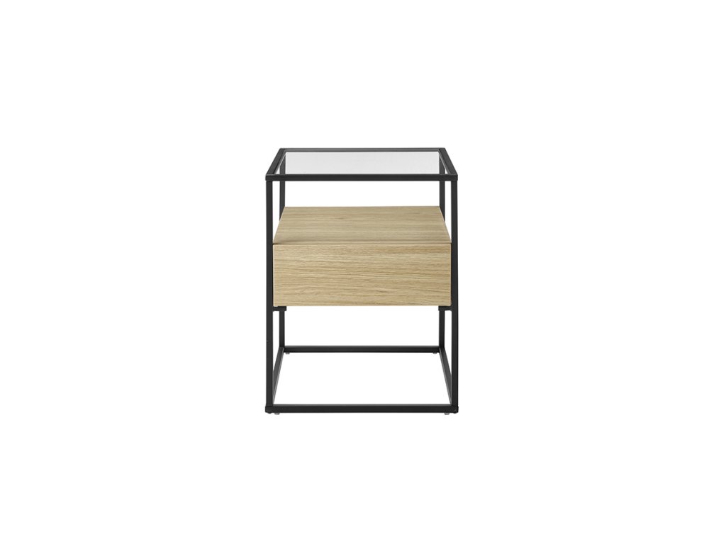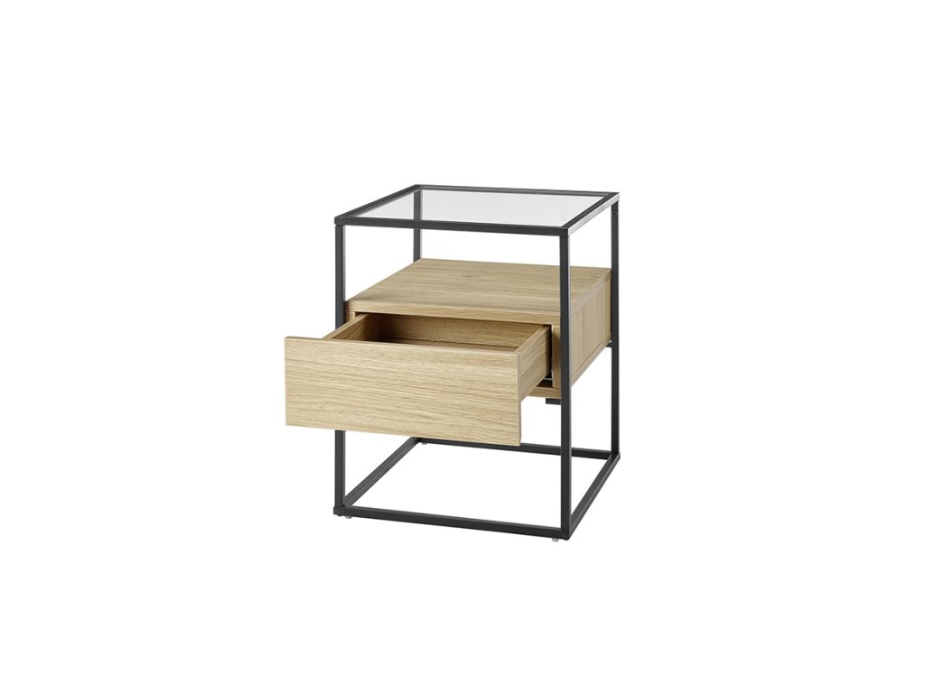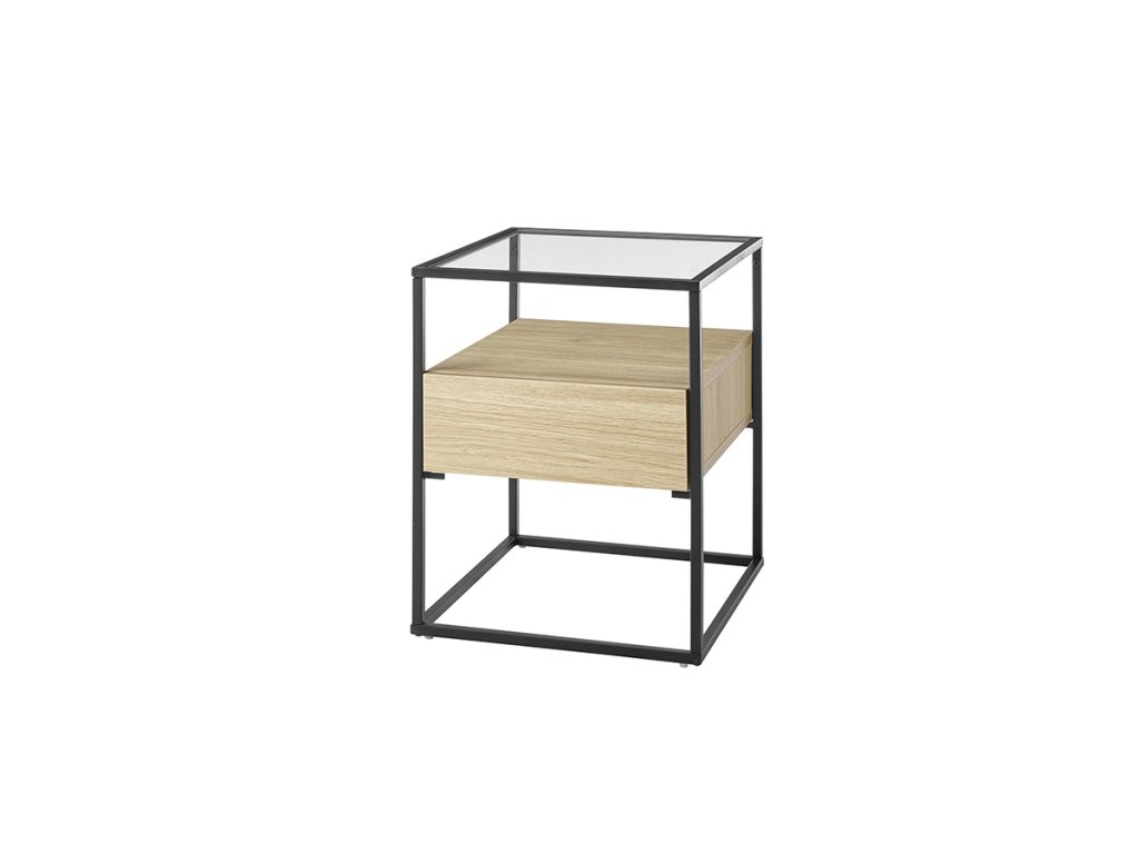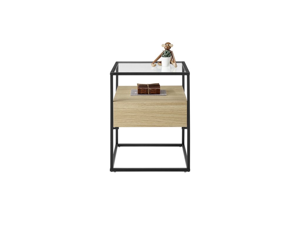 Čtvercový konferenční stolek se zásuvkou se vzhledem ke svým kompaktním rozměrům vyznačuje množstvím úložného prostoru. K uložení lze využít nejen samotnou zásuvku, ale také poličku nad ní. Pevná kovová podnož je pokryta černou práškovou barvou. Hlavní část se zásuvkou a poličkou se skládá z MDF desek pokrytých matnou dubovou fólií. Deska stolu je vyrobena z čirého skla.