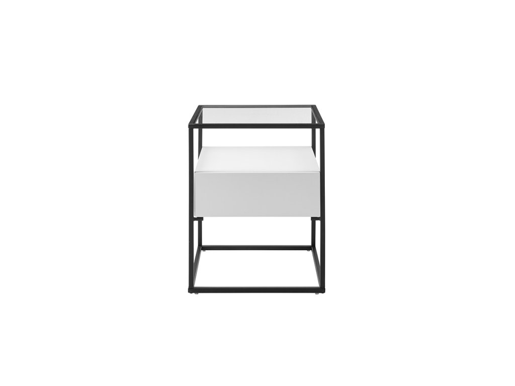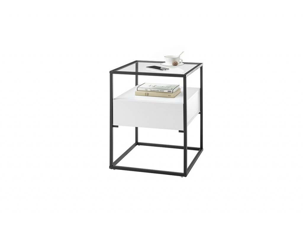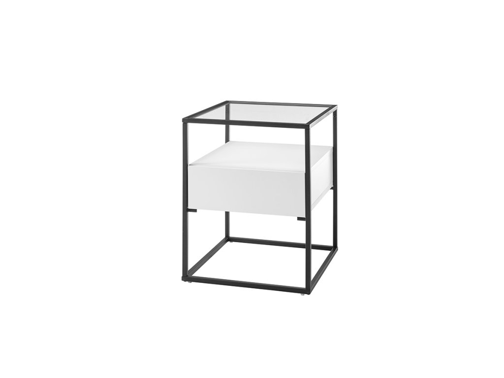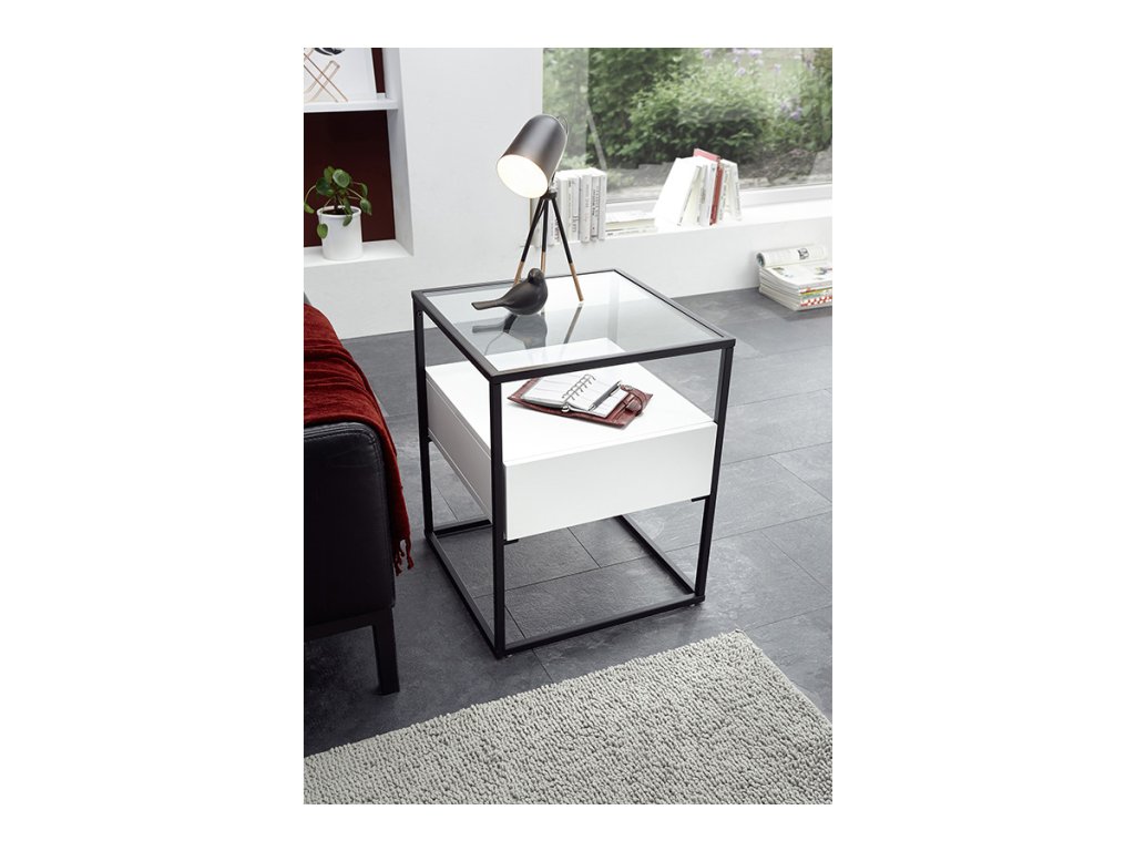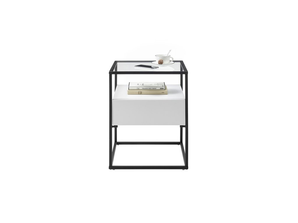 Čtvercový konferenční stolek se zásuvkou se vzhledem ke svým kompaktním rozměrům vyznačuje množstvím úložného prostoru. K uložení lze využít nejen samotnou zásuvku, ale také poličku nad ní. Pevná kovová podnož je pokryta černou práškovou barvou. Hlavní část se zásuvkou a poličkou se skládá z MDF desek pokrytých bílou matnou fólií. Deska stolu je vyrobena z čirého skla.