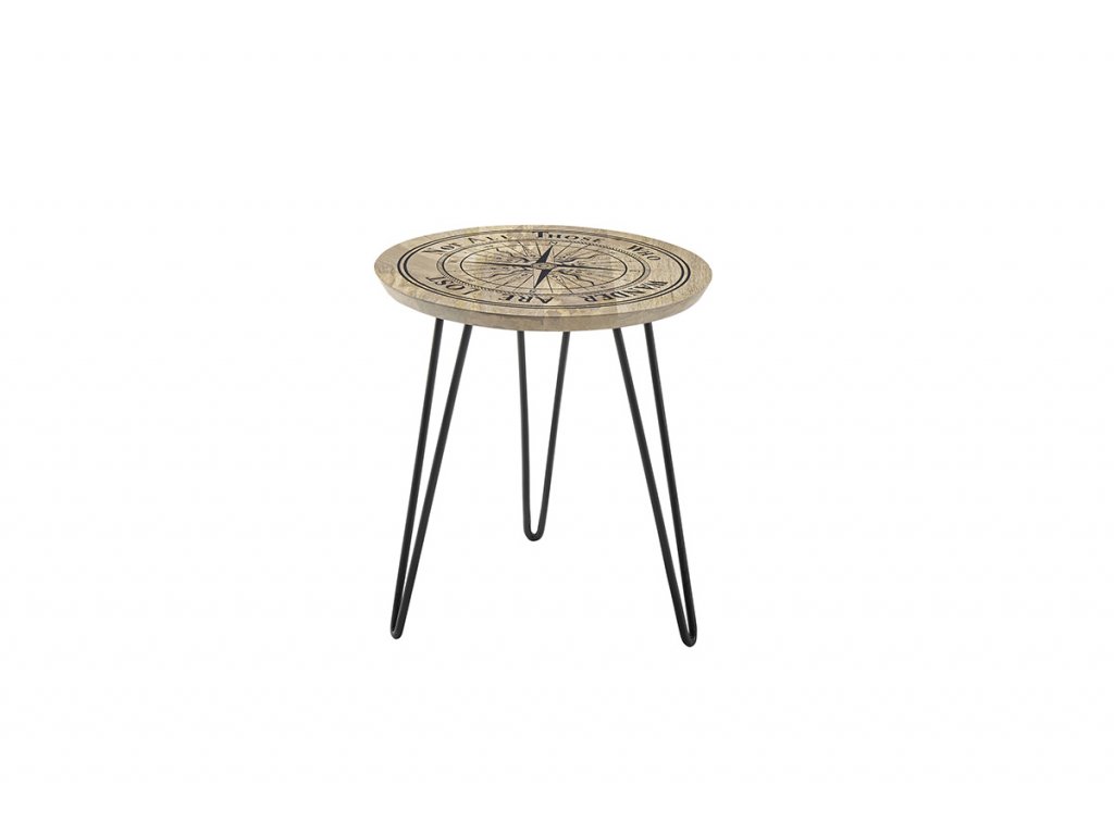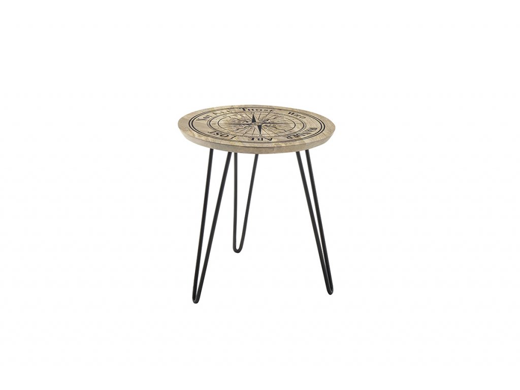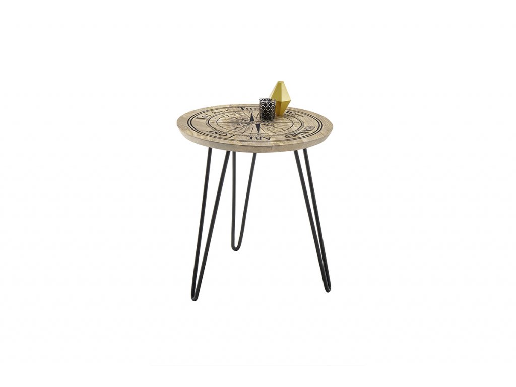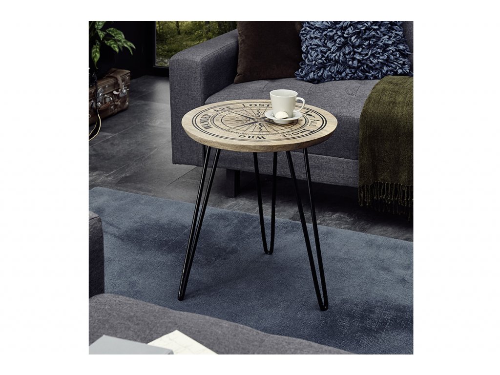 Kompaktní konferenční stolek, který se hodí téměř všude. Upoutá hlavně milovníky cestování a věčných romantiků. Deska stolu z mangového dřeva je totiž zkrášlena obrázkem v podobě kompasu. Samozřejmostí je pevná kovová podnož pokrytá černým matným lakem.