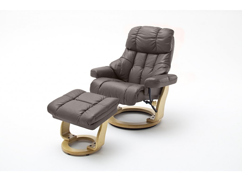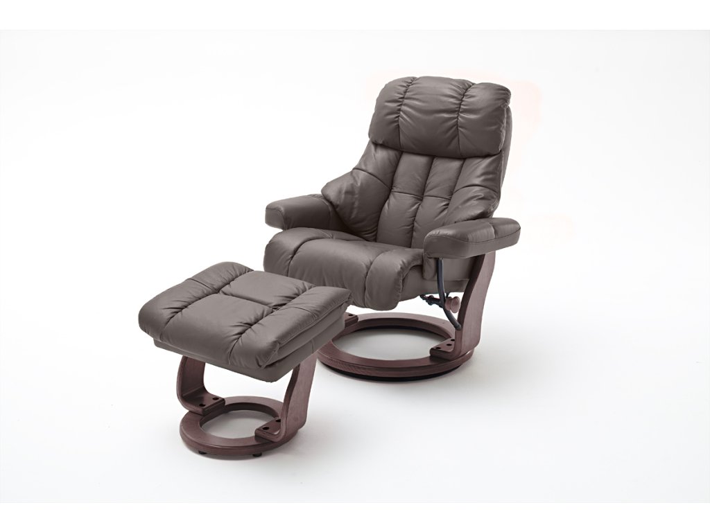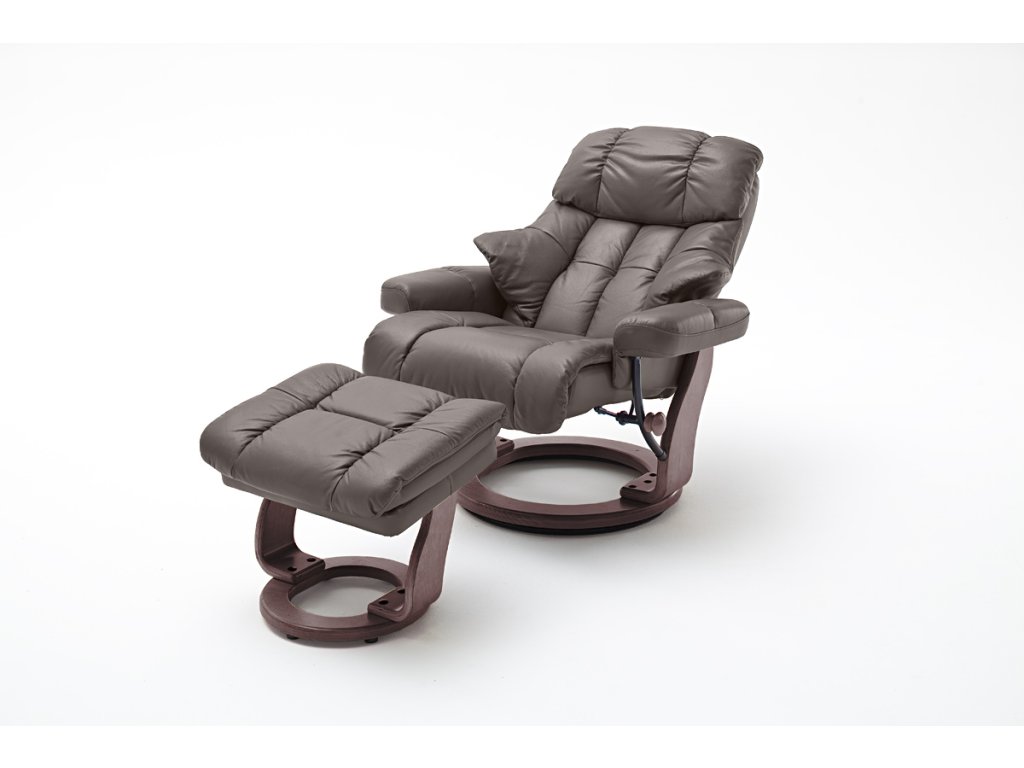Luxusní kožené křeslo s praktickou podnožkou, která disponuje úložným prostorem, je charakteristické kvalitním a velice pohodlným sezením. Relaxační křeslo je polohovatelné a samozřejmě otočné. Má čalúnenené loketní opěrky a nastavitelné opěradlo tělesným tlakem / 135 ° /. Hnědá kůže v kombinaci se dřevem bude zaručeně exkluzivním doplňkem vašeho interiéru. Stačí si už jen vybrat provedení podstavy.
