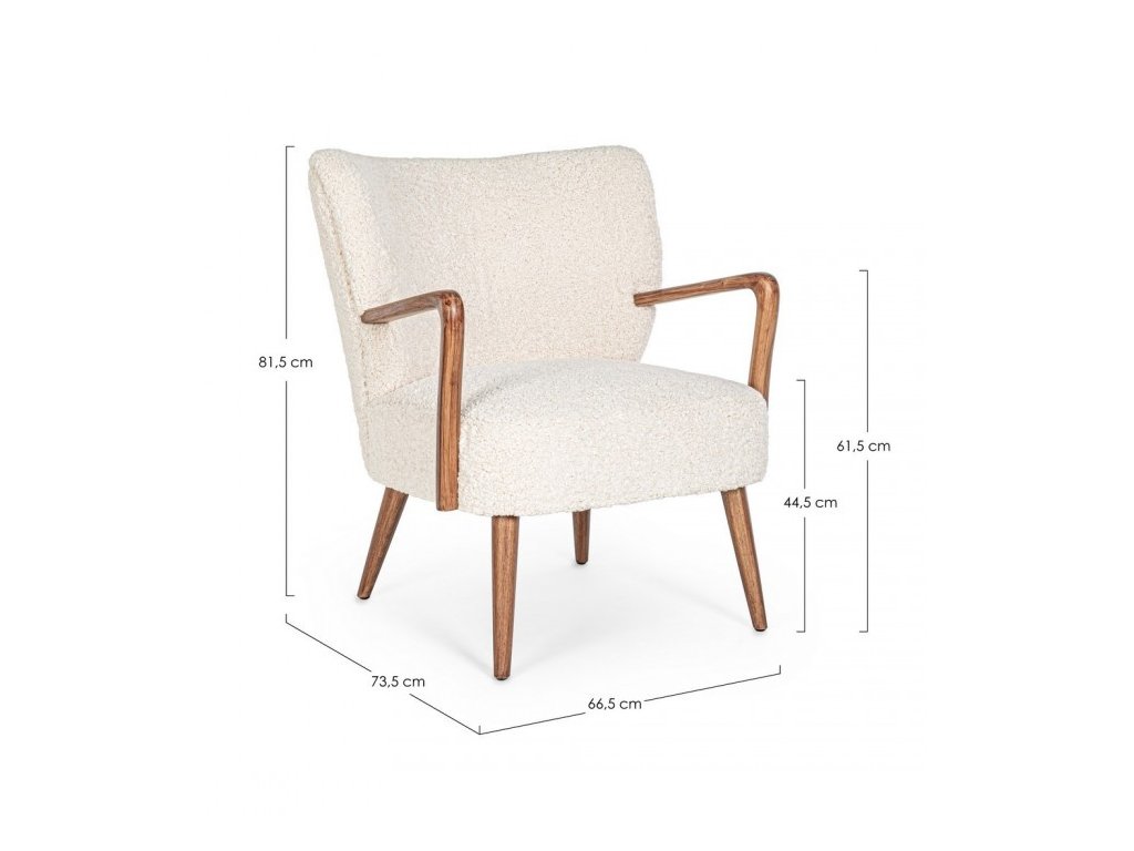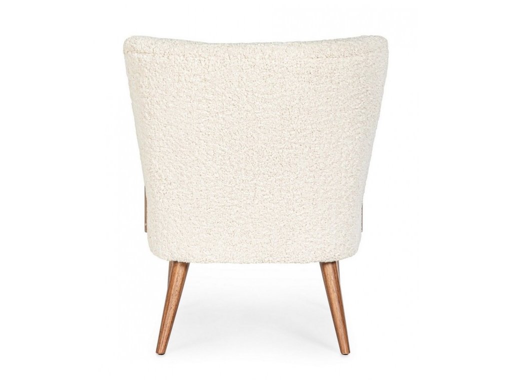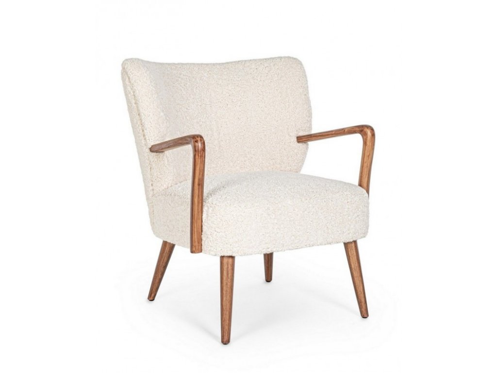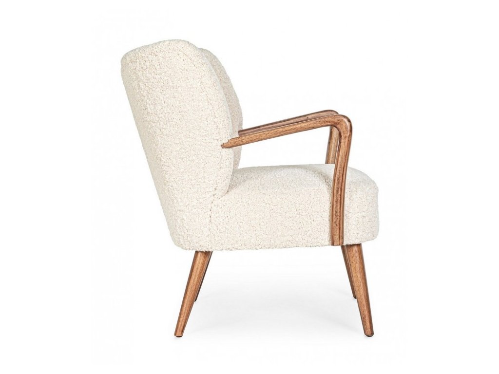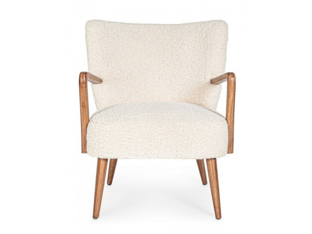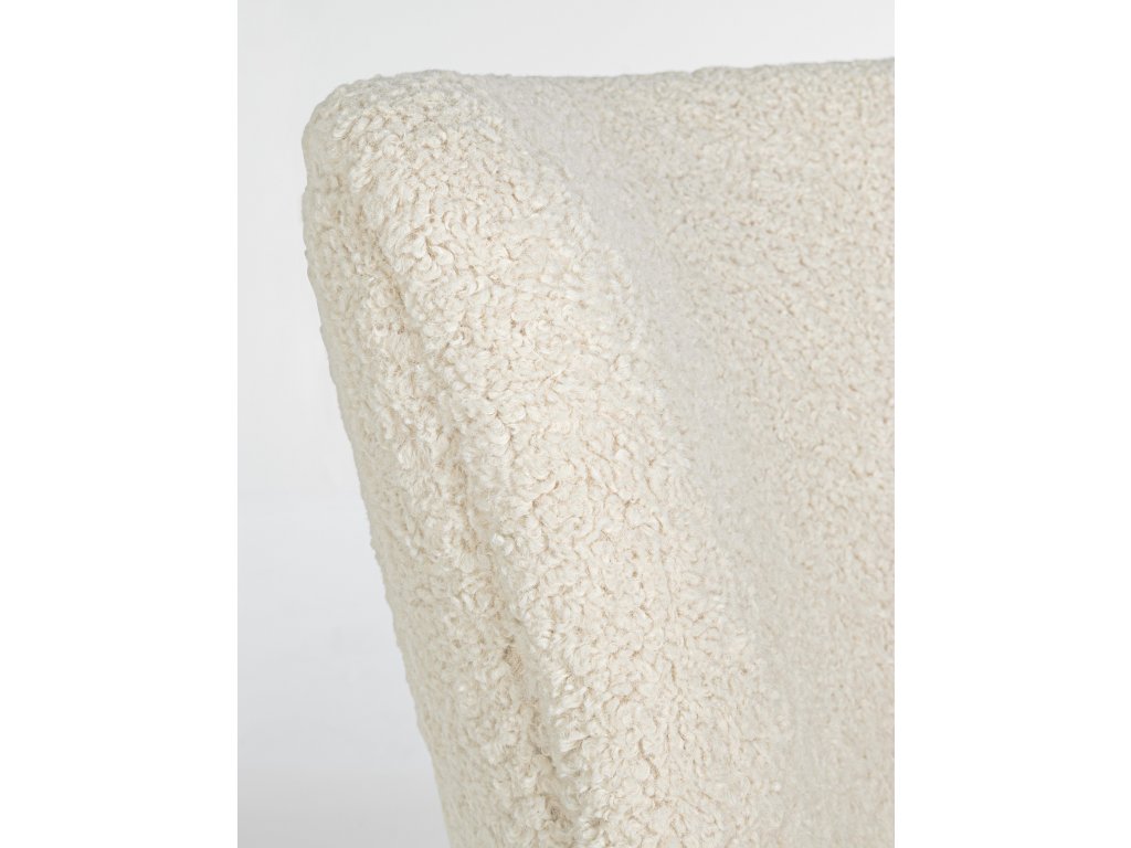 Pohodlné křeslo v bílé barvě v bouclé provedení přinese do vašeho interiéru nejen pohodlí, ale také styl. Kombinace látky bouclé s vlněným efektem s nohama z kaučukovníku dodává křeslu retro vzhled.