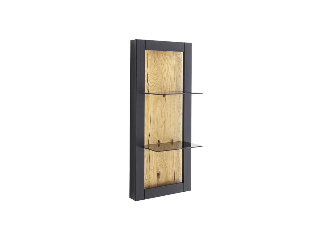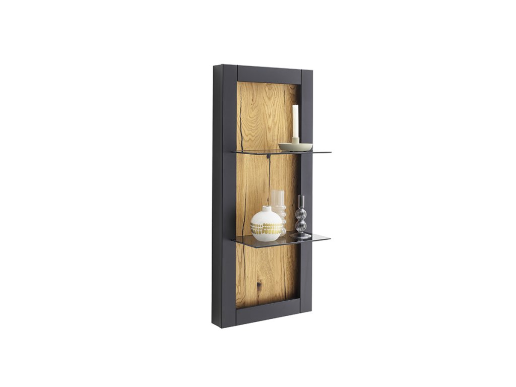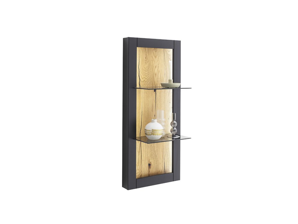 Skvělá kompaktní dvojpolička Cesena matném černosivém provedení. Prvek z olejované dubové dýhy. Kombinace, která je nejen moderní, ale také funkční. Se skleněnými poličkami o nosnosti 2 + 2 kg. Dokonce se může i rozzářit, pokud si zvolíte doplňkové osvětlení.