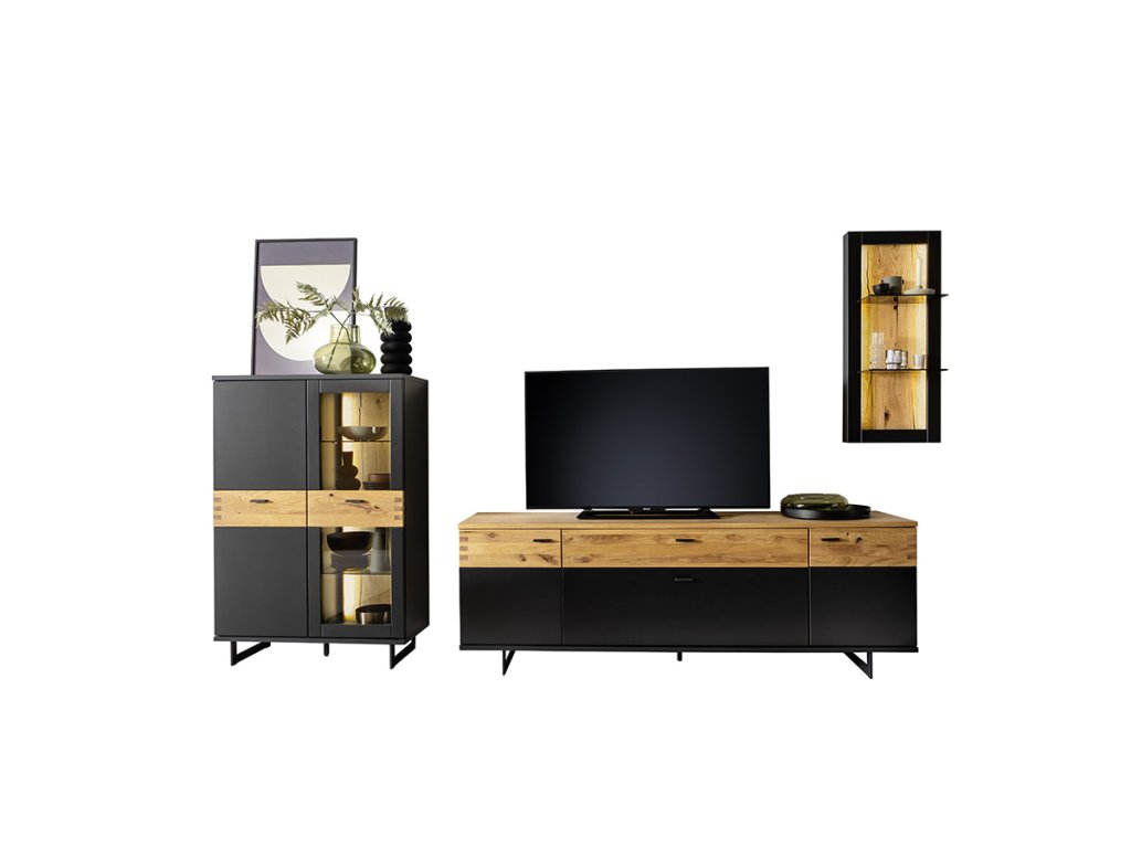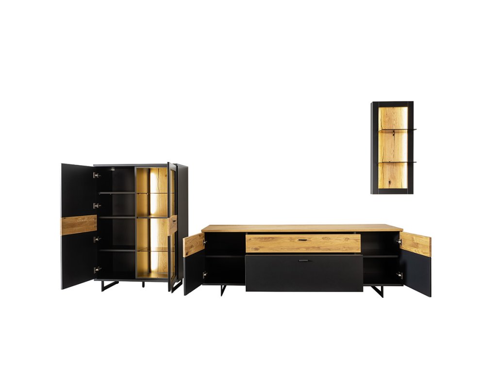 | Materiál: | MDF černošedá melamin, dubová dýha olejovaná, sklo |