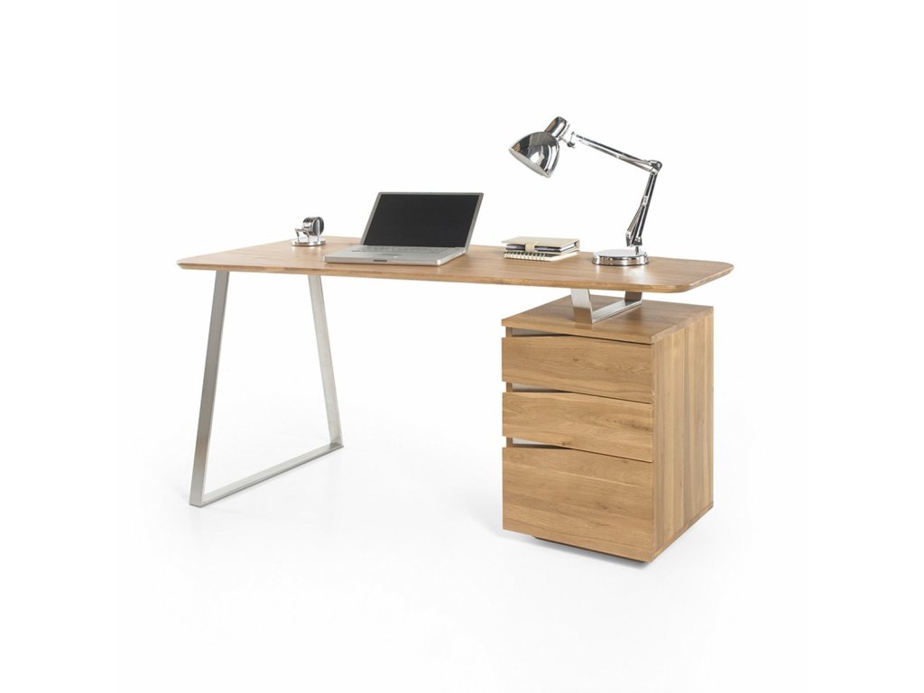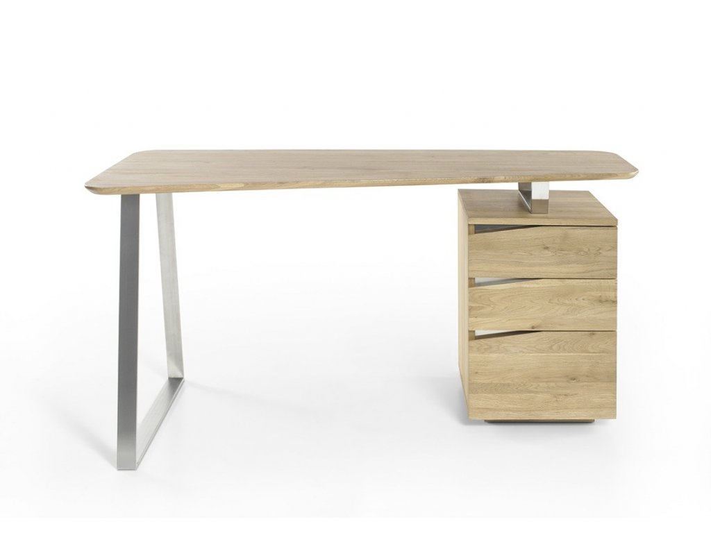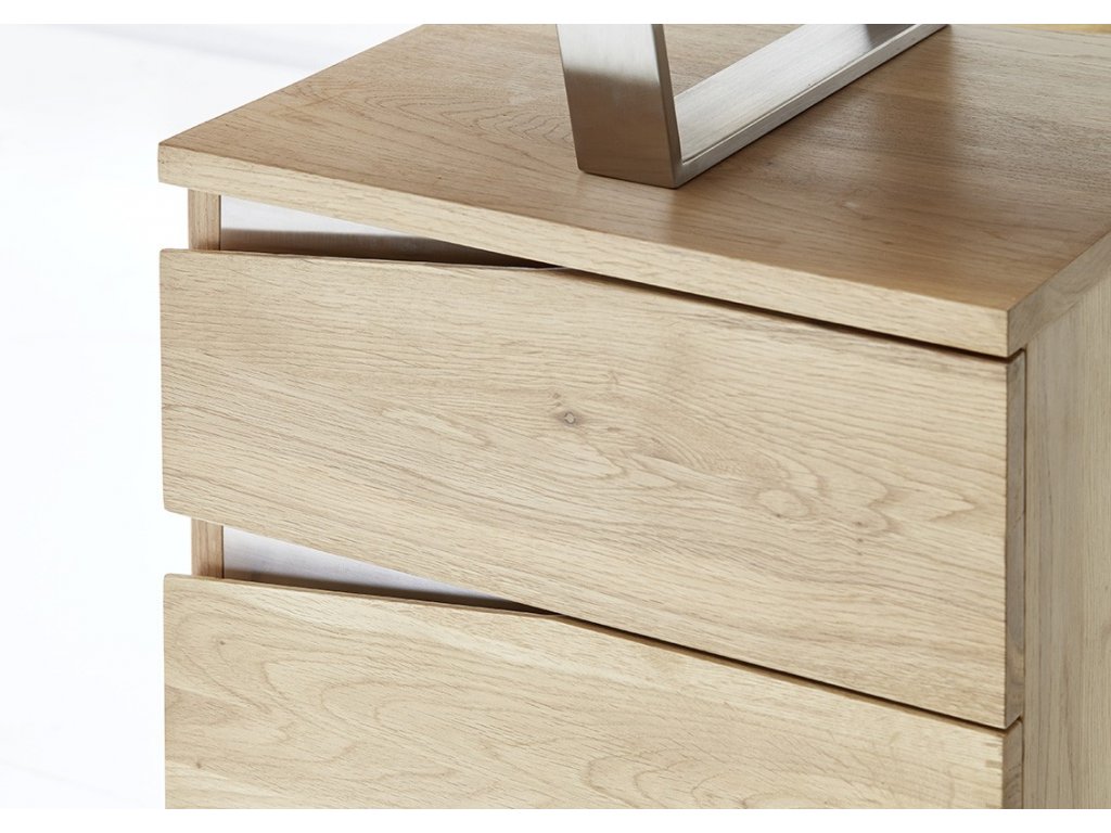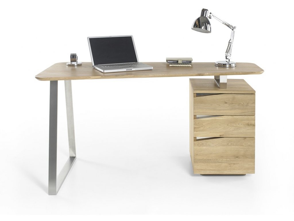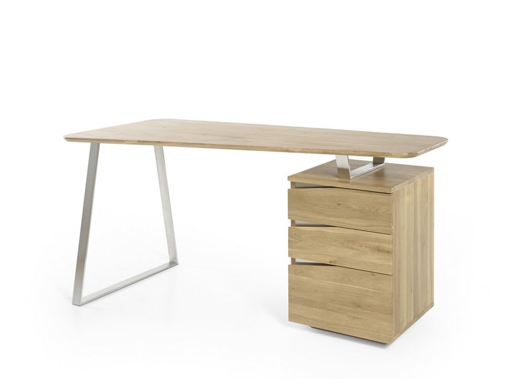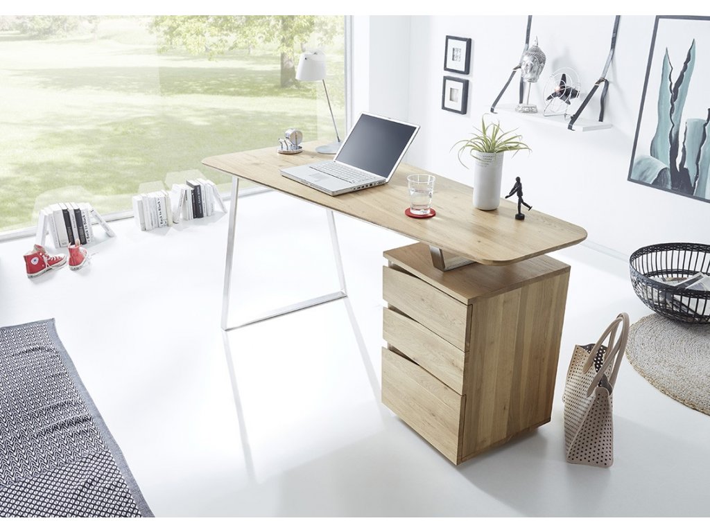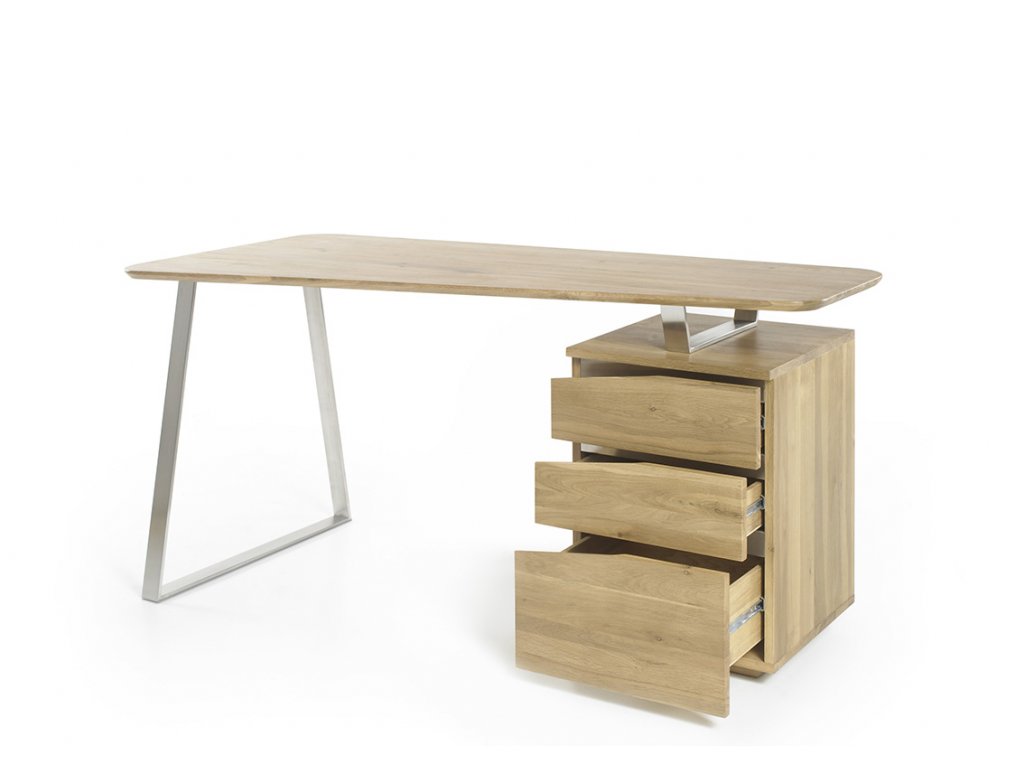 Nádherný pracovní stolek, který je výjimečný svým provedením vrchní asymetrické desky z dubového masivu. Každý kus je originál svojí strukturou a barvou. Moderní a nadčasový design dodává stolku podstava ve tvaru trojúhelníku a zásuvky se šikmými úchyty. Nosnost 30 kg. Šířka desky v užší části 42 cm.