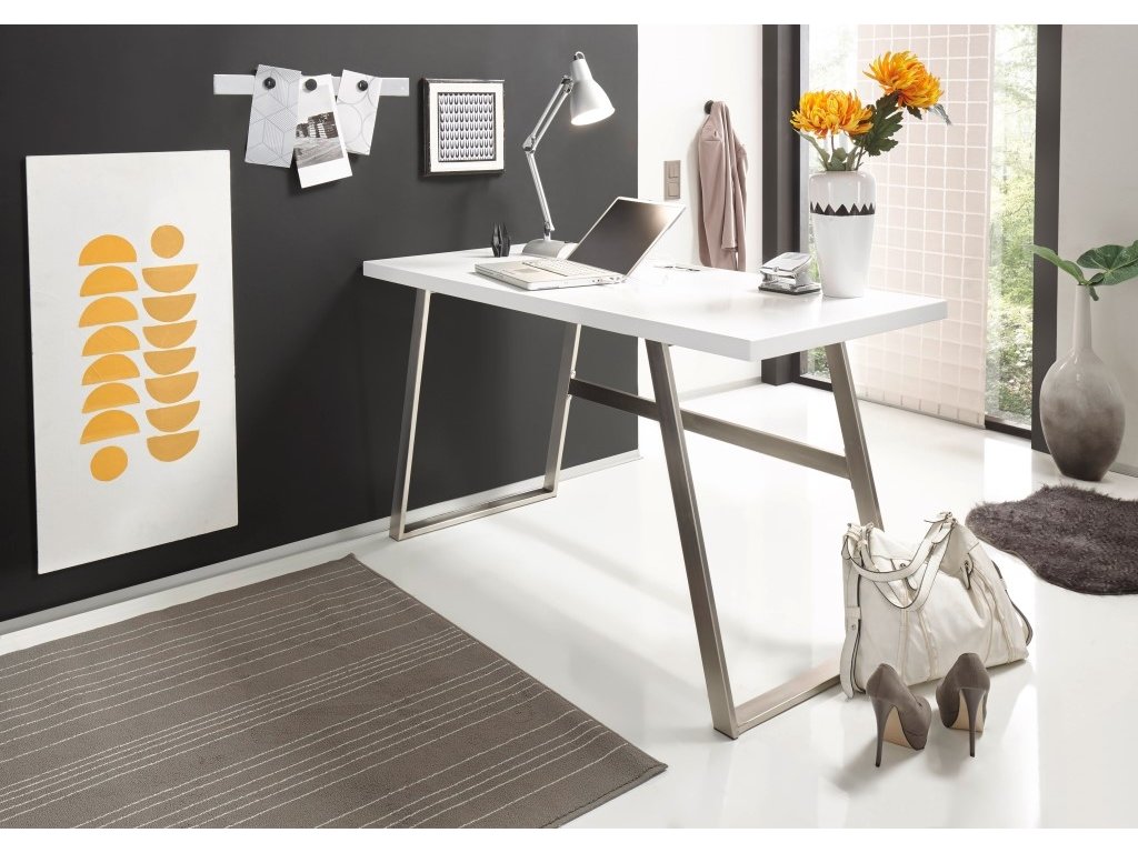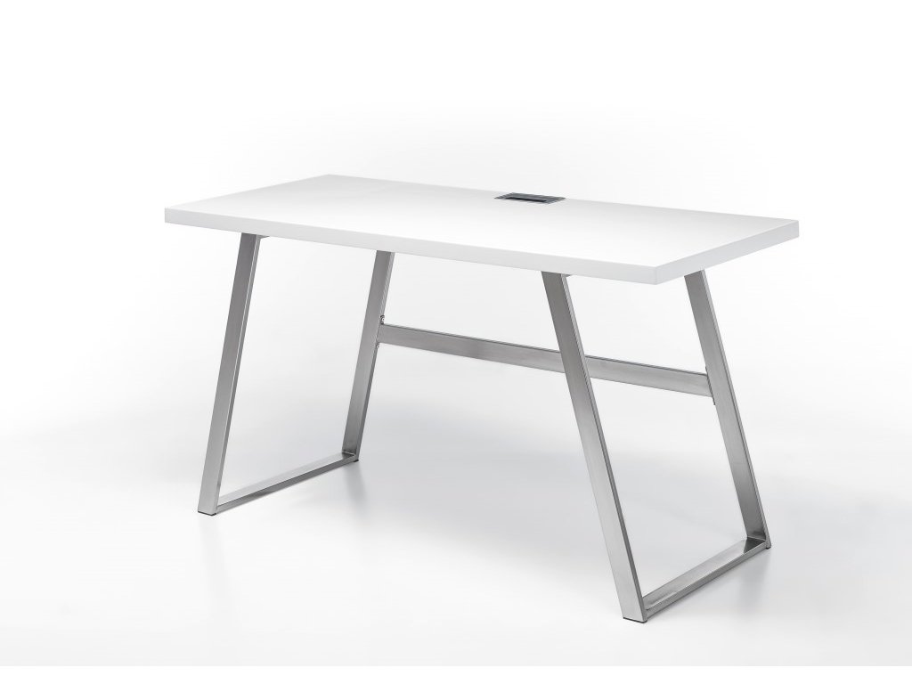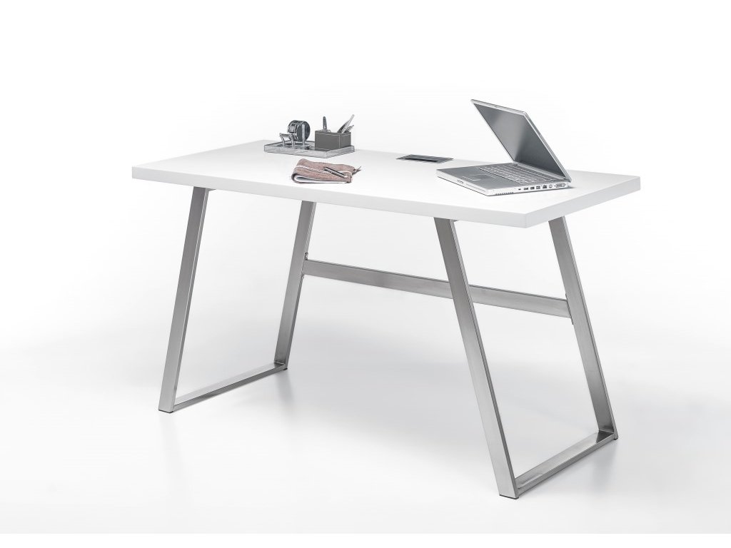 Krásný designový pracovní stůl Andria v bílém matném provedení stolní desky je ideální pro milovníky vysoké kvality, vzdušnosti a jednoduchosti. Stůl má pevnou kovovou podnož v optice nerezové oceli, na kterou se lze spolehnout. S praktickým otvorem pro kabely. Nosnost stolu je do 30 kilogramů.
