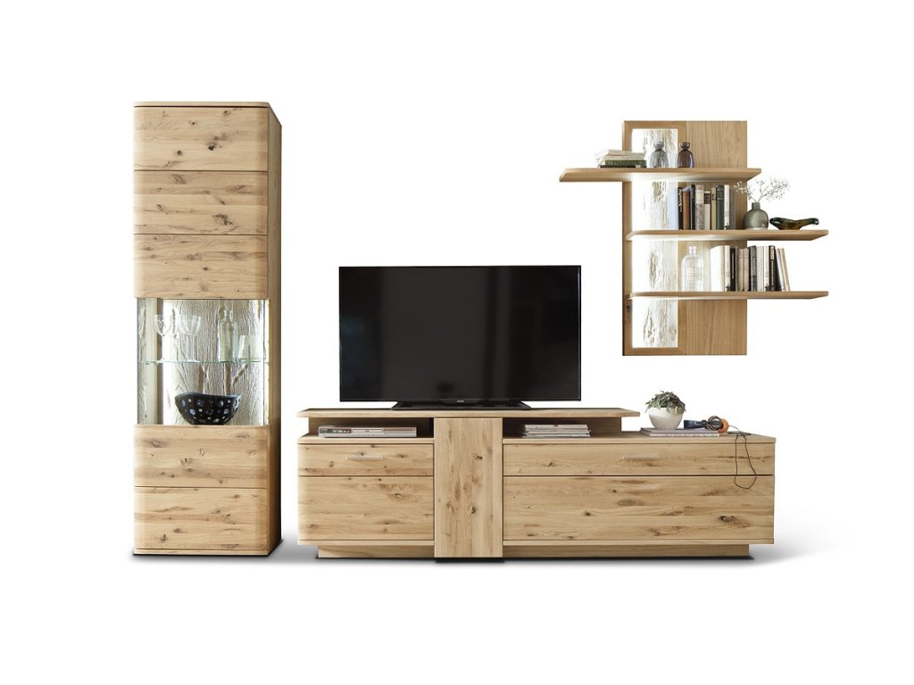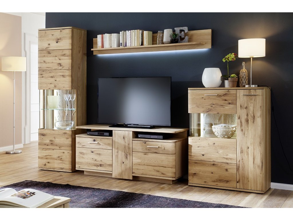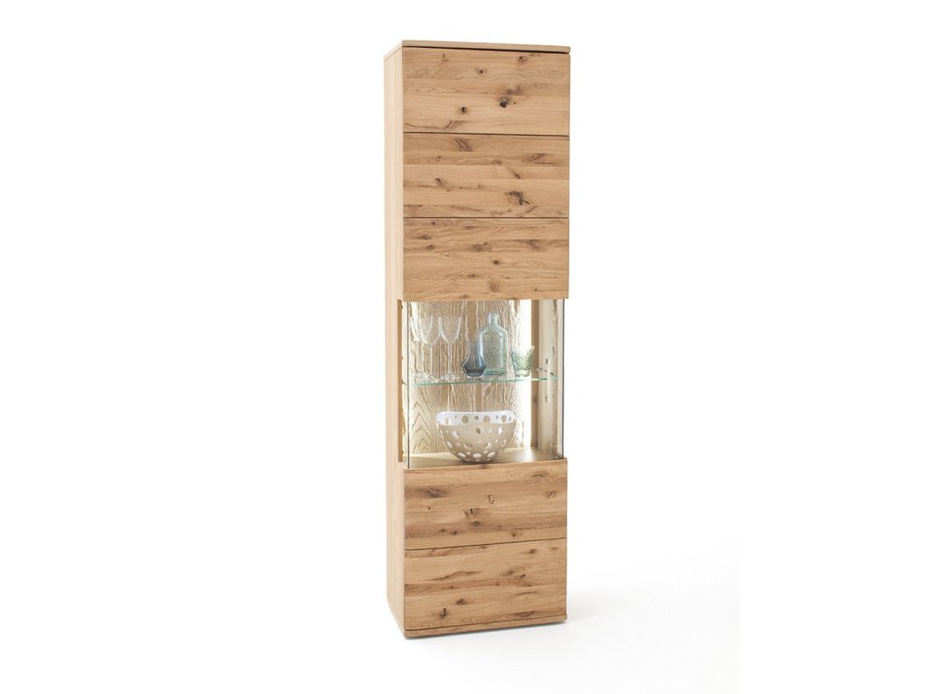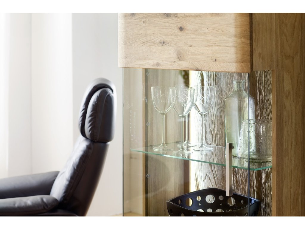 Designová, 1-dveřová skříň s vitrínou která je doplněna ovolitelné LED osvětlení. Skříň je vyhotovena z olejovaného dubového dřeva. V nabídce se nacházejí i další kousky z této kolekce, stačí do vyhledávání zadat "SANTORI" pro jejich zobrazení.