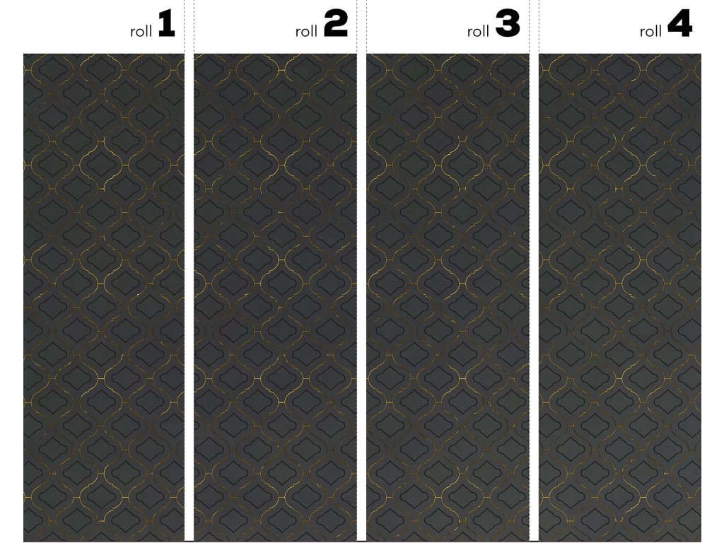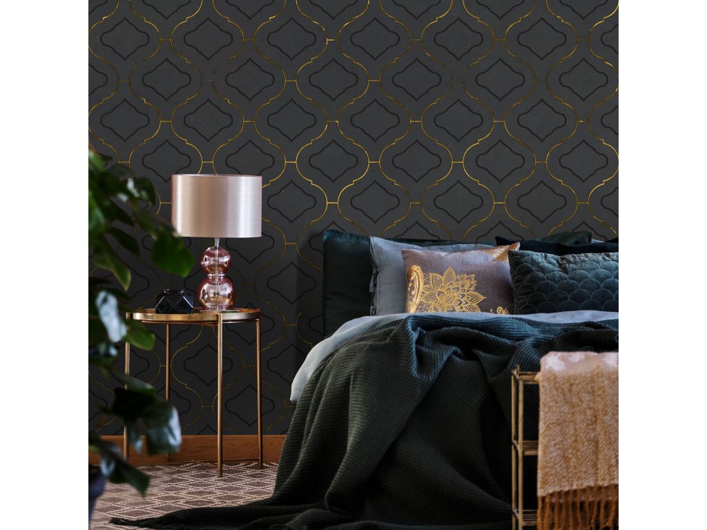 Tapety se zlatými, stříbrnými a měděnými prvky jsou vytvořeny vytištěním textury příslušnou barvou do materiálu.