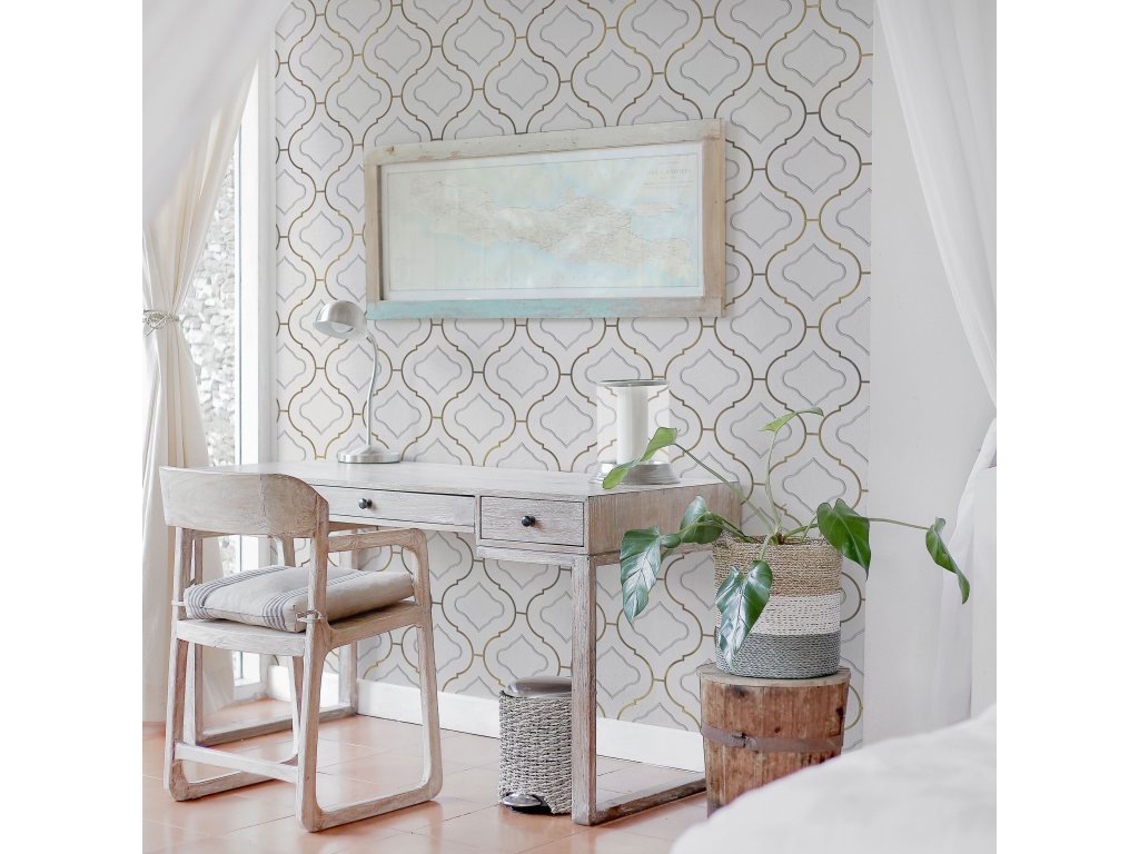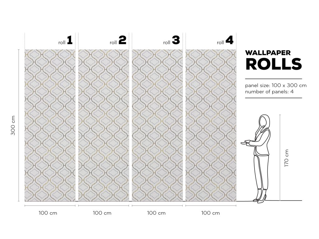 Tapety se zlatými, stříbrnými a měděnými prvky jsou vytvořeny vytištěním textury příslušnou barvou do materiálu.