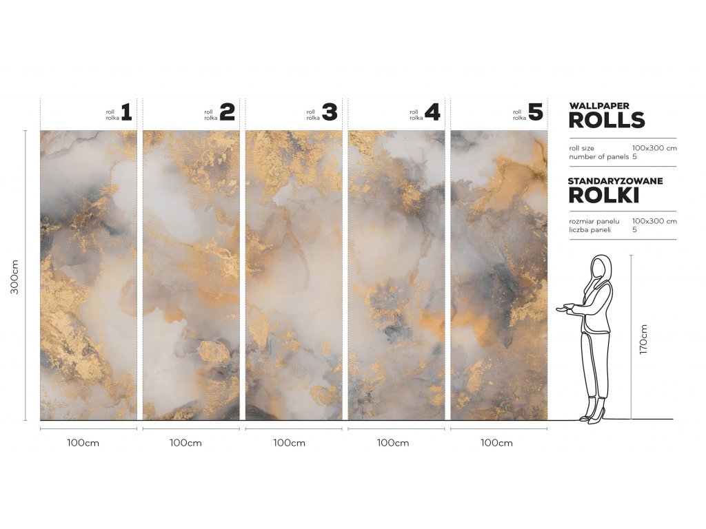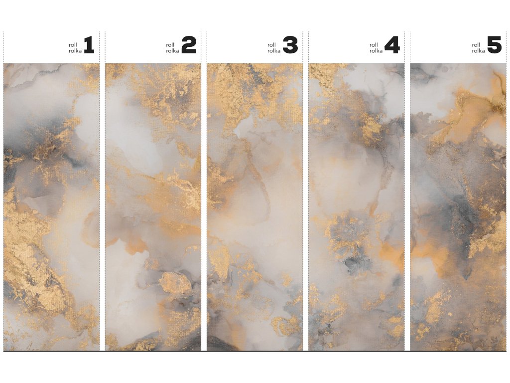 Tapety se zlatými, stříbrnými a měděnými prvky jsou vytvořeny vytištěním textury příslušnou barvou do materiálu.