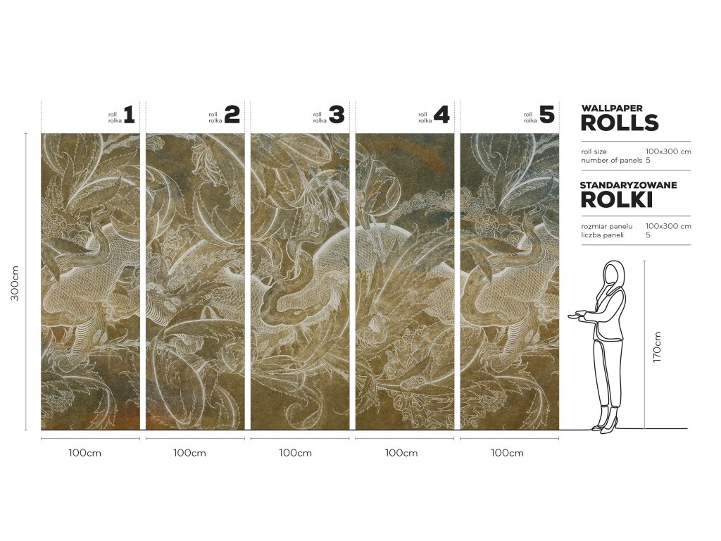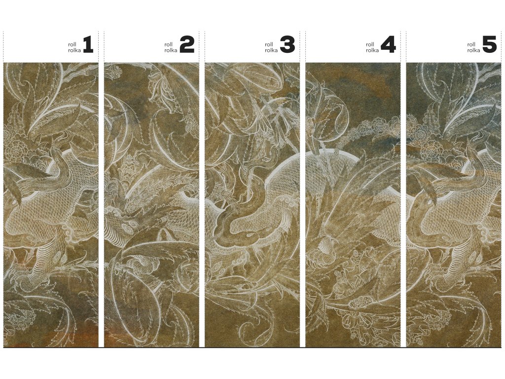 Tapety se zlatými, stříbrnými a měděnými prvky jsou vytvořeny vytištěním textury příslušnou barvou do materiálu.