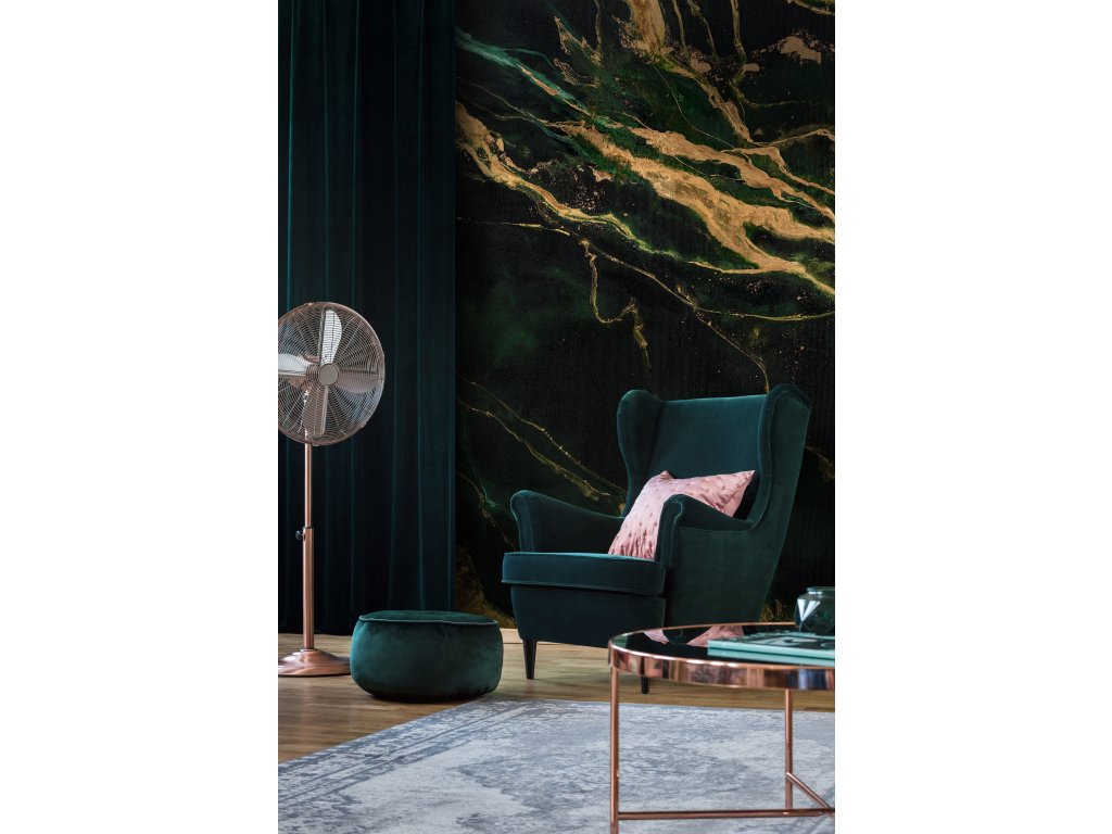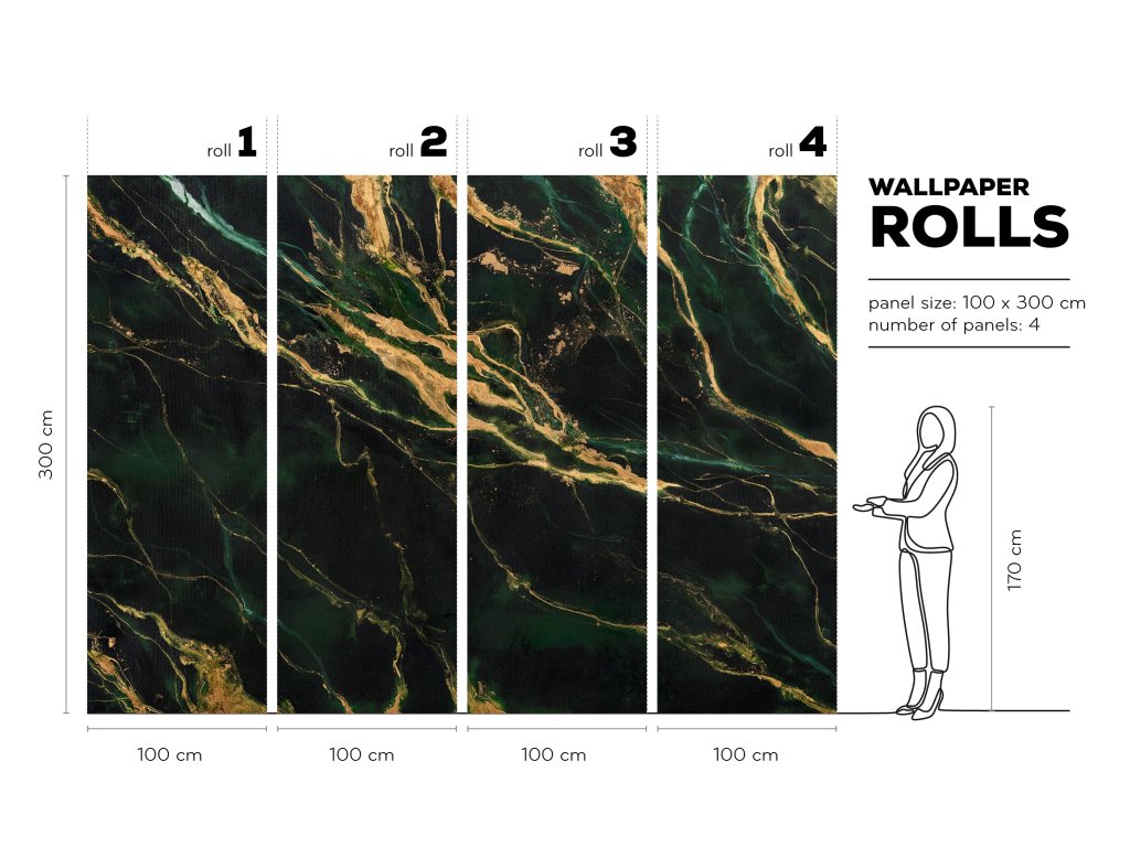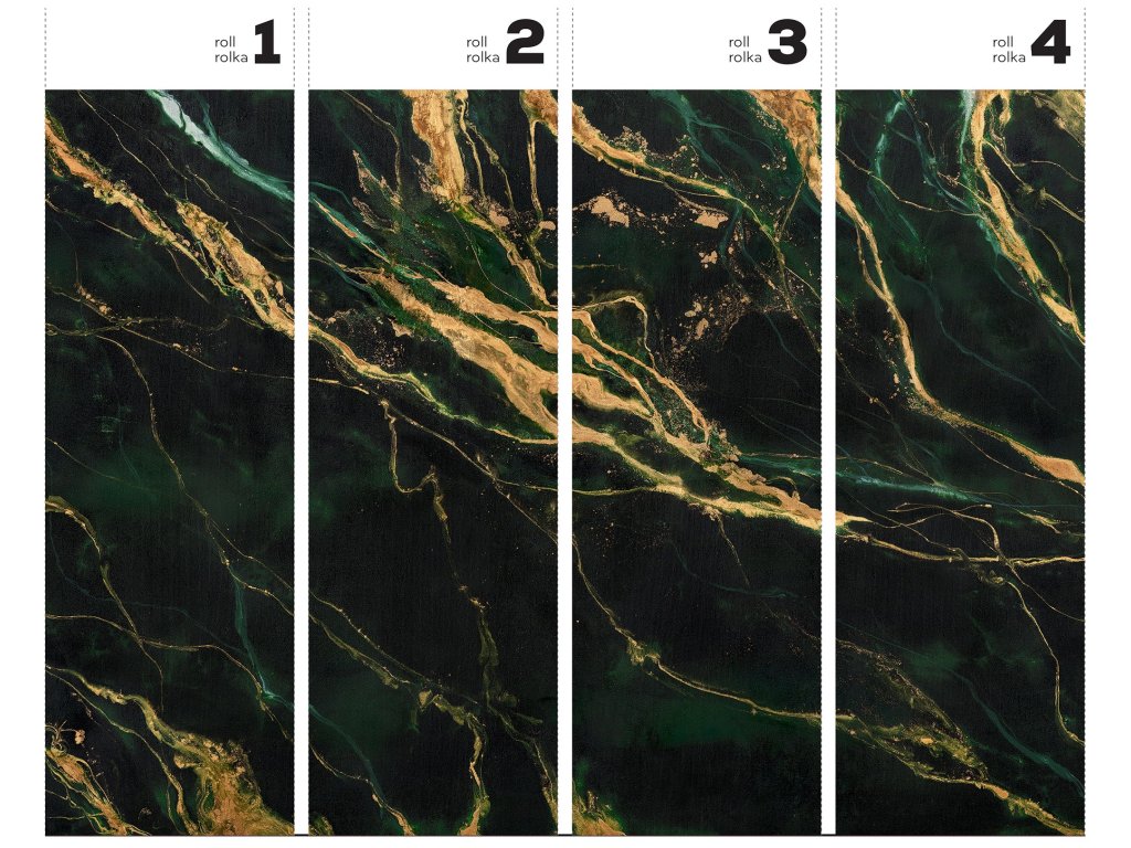 Tapety se zlatými, stříbrnými a měděnými prvky jsou vytvořeny vytištěním textury příslušnou barvou do materiálu.