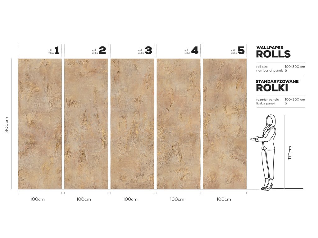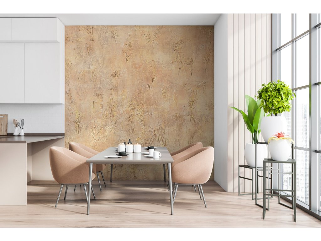 Tapety se zlatými, stříbrnými a měděnými prvky jsou vytvořeny vytištěním textury příslušnou barvou do materiálu.