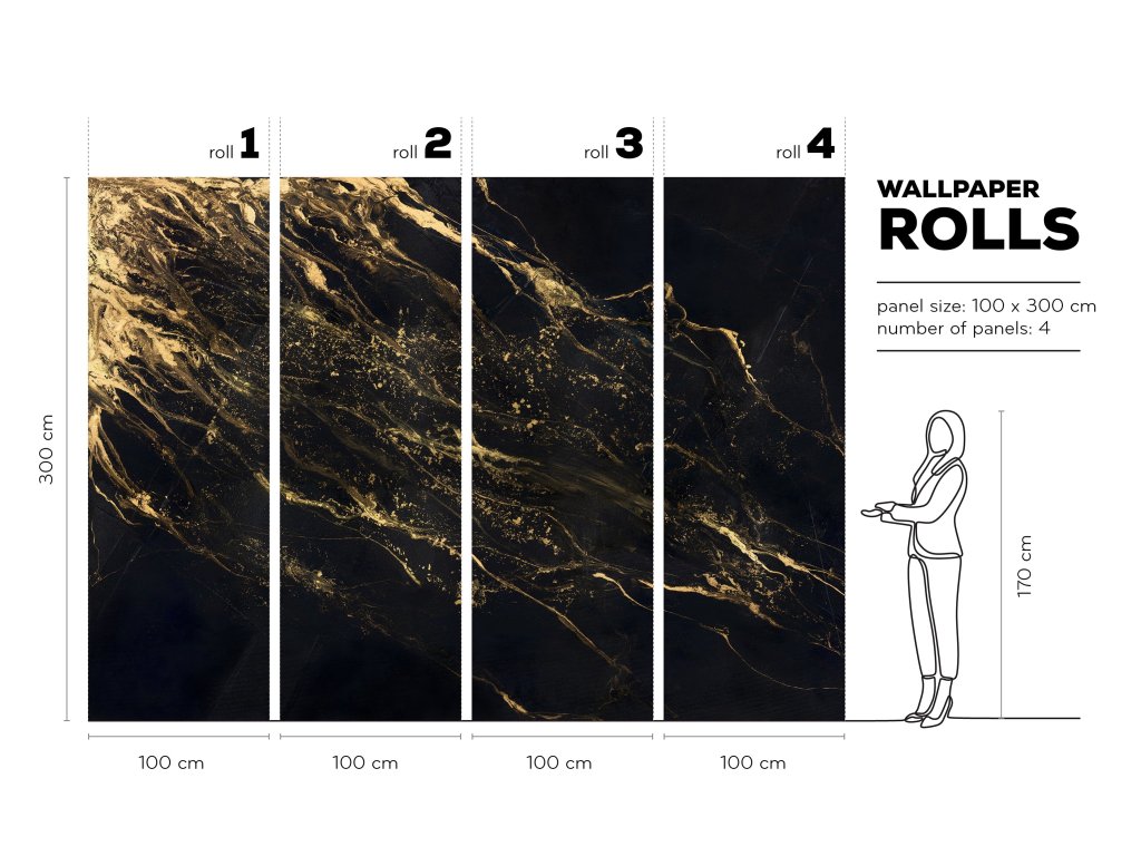 Tapety se zlatými, stříbrnými a měděnými prvky jsou vytvořeny vytištěním textury příslušnou barvou do materiálu.