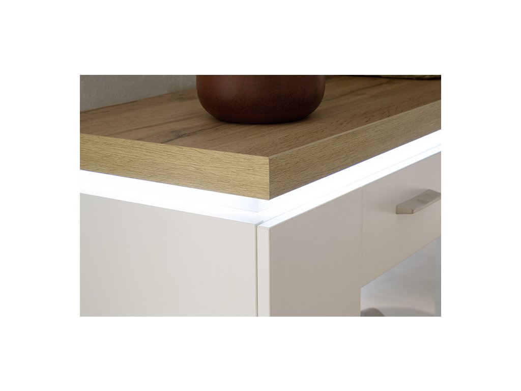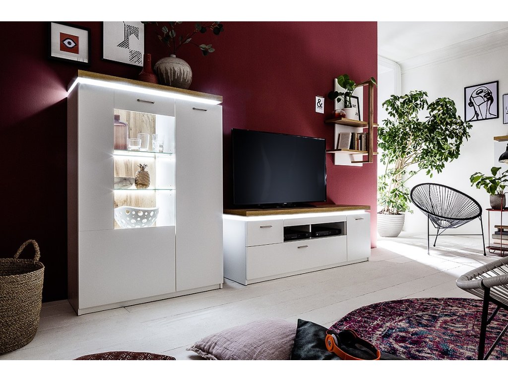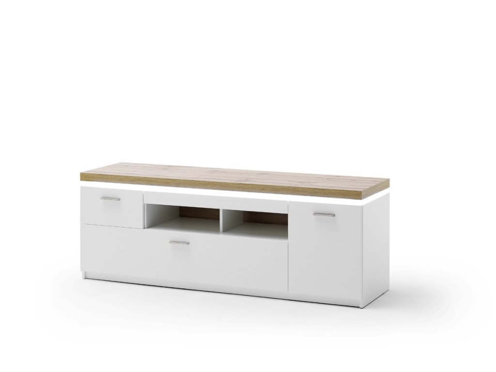 TV stolek z designové kolekce nábytku "CALI". Styl tohoto stolku vyznačuje hlavně kombinací bílé repliky melaminu a repliky dubového melaminu. Stolek disponuje nabízí úložný prostor v podobě 1 malé zásuvky, 1 velké zásuvky a 1 skříňky s dvířky. Disponuje LED osvětlením.