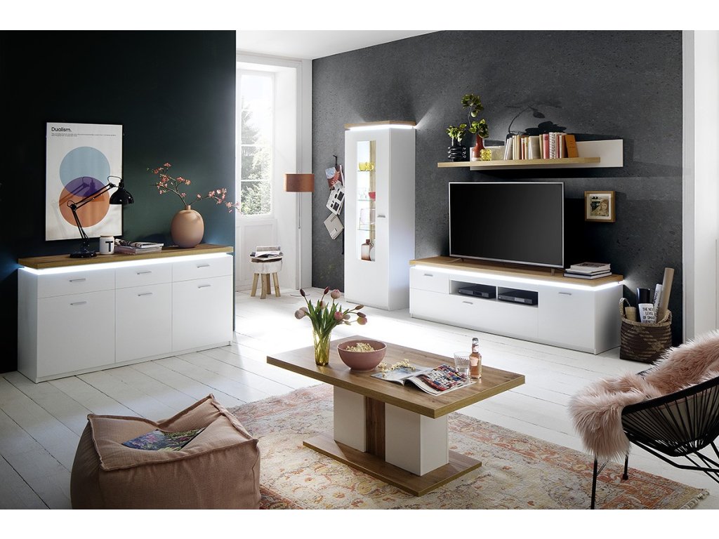 TV stolek z designové kolekce nábytku "CALI". Styl tohoto stolku vyznačuje hlavně kombinací bílé repliky melaminu a repliky dubového melaminu. Stolek disponuje nabízí úložný prostor v podobě 1 malé zásuvky, 1 velké zásuvky a 1 skříňky s dvířky. Disponuje LED osvětlením.