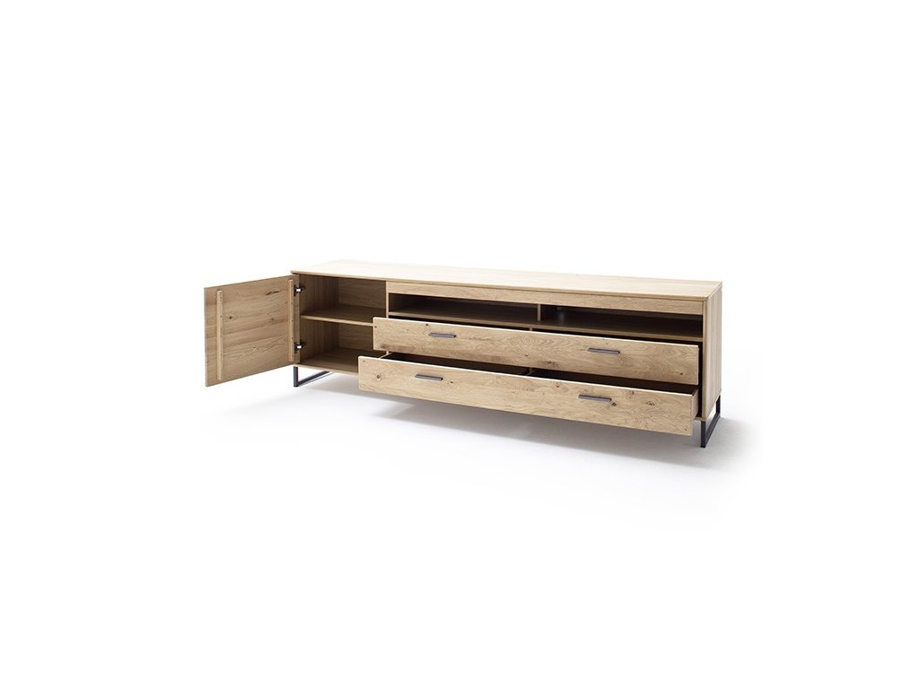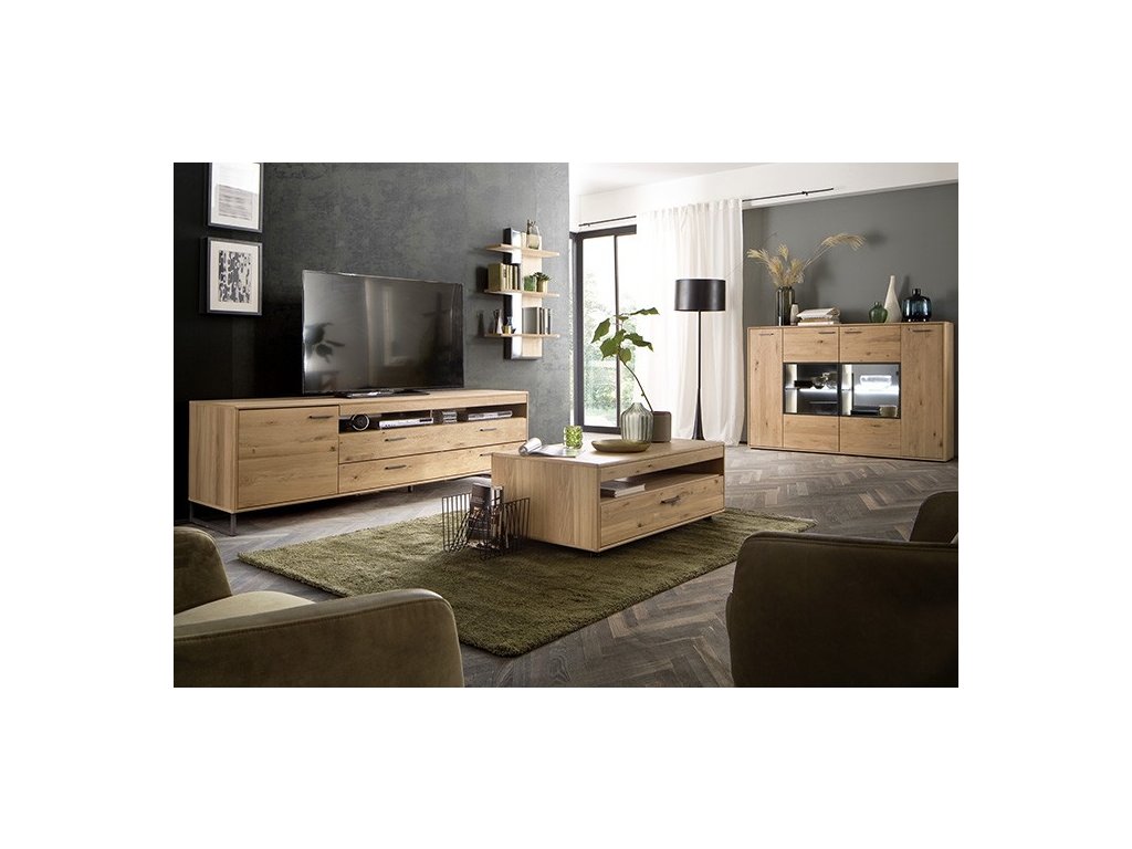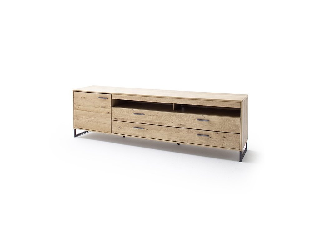 Designový TV stolek v provedení dub Bianco v kombinaci s antracitovými prvky a imitací dubového dekoru. Stolek disponuje úložným prostorem v podobě zásuvek a skříňky. V nabídce se nacházejí i další kousky z této kolekce, stačí do vyhledávání zadat "PORTLAND" pro jejich zobrazení.