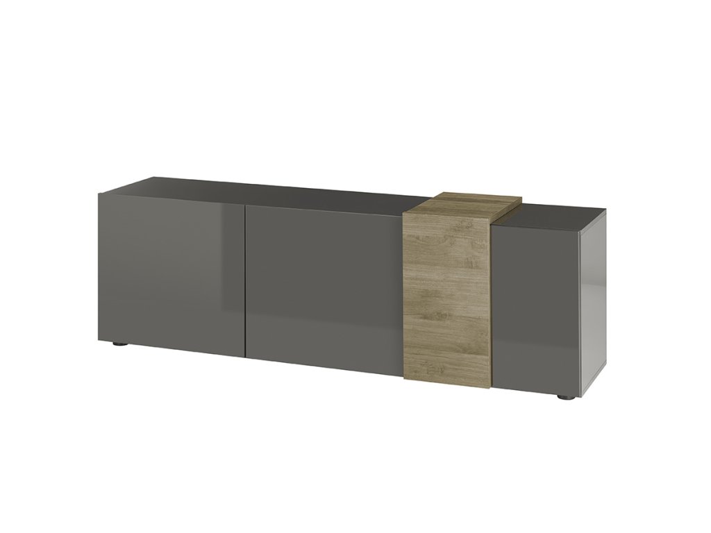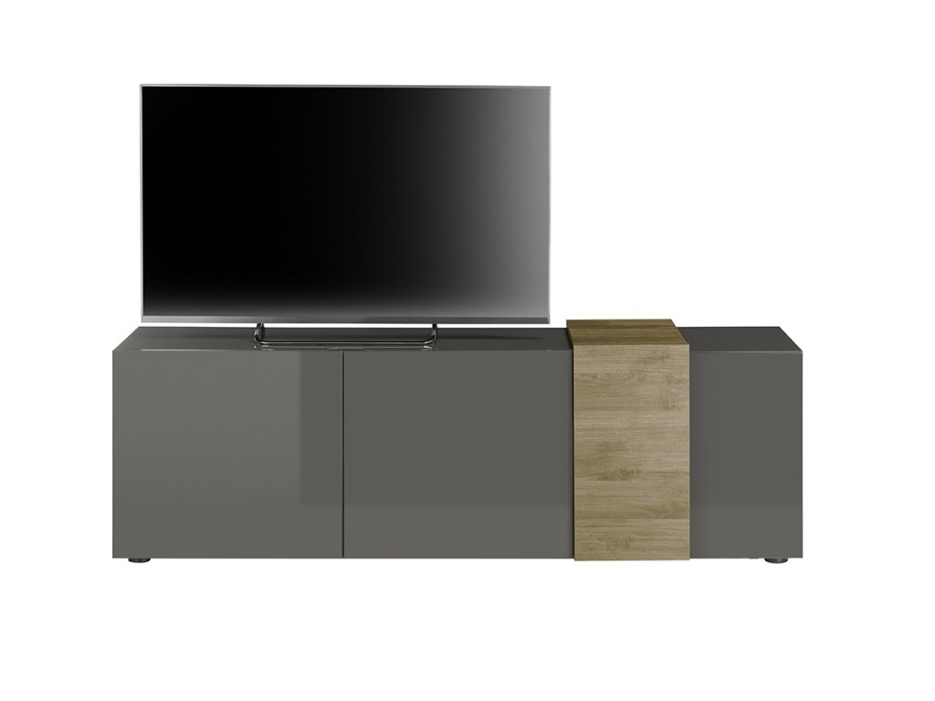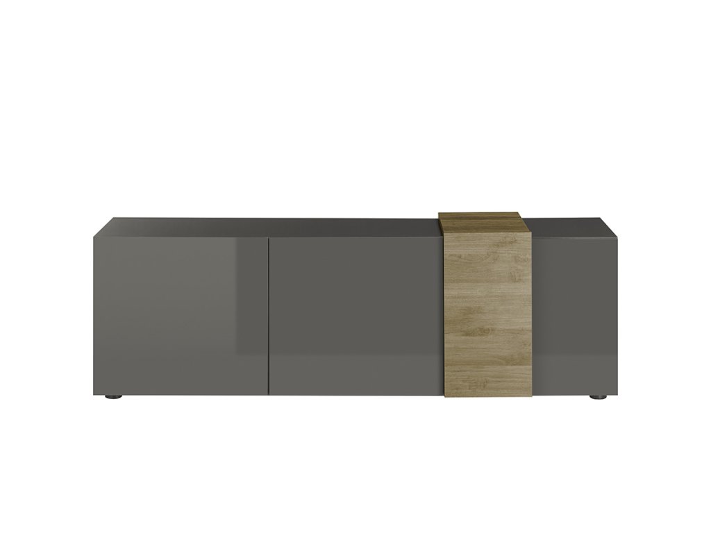 Moderní nízký TV stolek/komoda s trojicí dvířek s vysoce lesklými předními stranami. V andracitové barvě. Korpus a přední části jsou vyrobeny z laminovaných MDF desek. Část stolku je v provedení dubu Mercure. Samozřejmostí jsou dvířka s tichým zavíráním. Horní police má maximální nosnost 30 kg a je vhodná pro televizory do 80". Za každými dvířky se nachází pevná vnitřní polička.