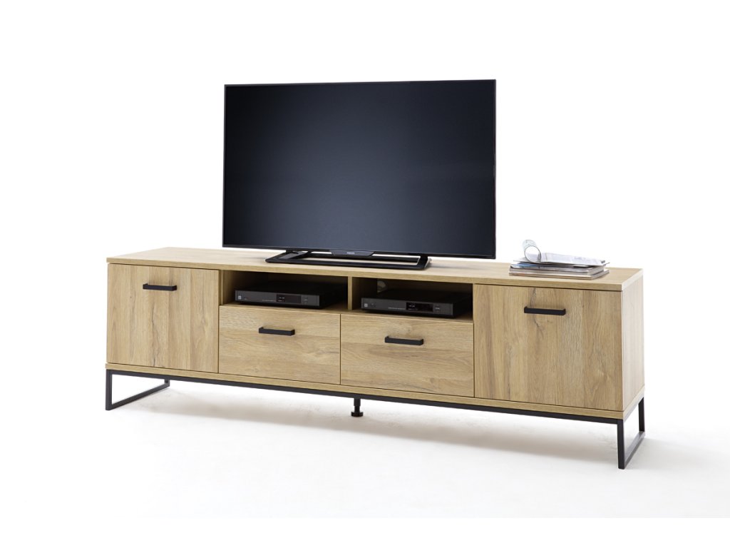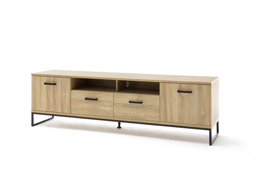 Unikátní TV stolek TOLEDO je oblíbeným produktem v naší nabídce. Ocení jej hlavně uživatelé, kteří upřednostňují nábytek v přírodním barevném provedení. Je vhodný hlavně do moderních obývacích pokojů. Prozáří světlé prostory a přinese oživení do těch tmavších. Přední strana a korpus jsou z laminátových desek v dekoru dubu Grandson. Povrch je pokryt melaminem pro vyšší životnost. Podnož a rukojeti zásuvek jsou z kovu. Je chráněn černým práškovým lakem. Stolek ukrývá dostatek úložných prostor, dvojici prostorných zásuvek, které sekunduje dvojice bočních skříněk. Zásuvky jsou vybaveny tlumeným dojezdem.