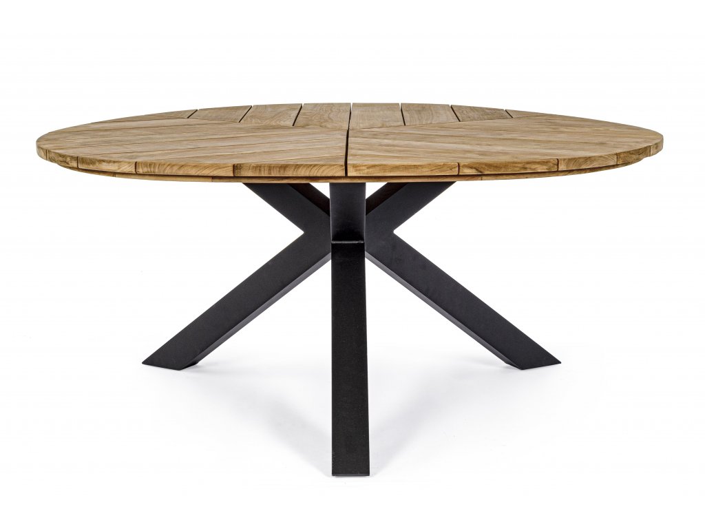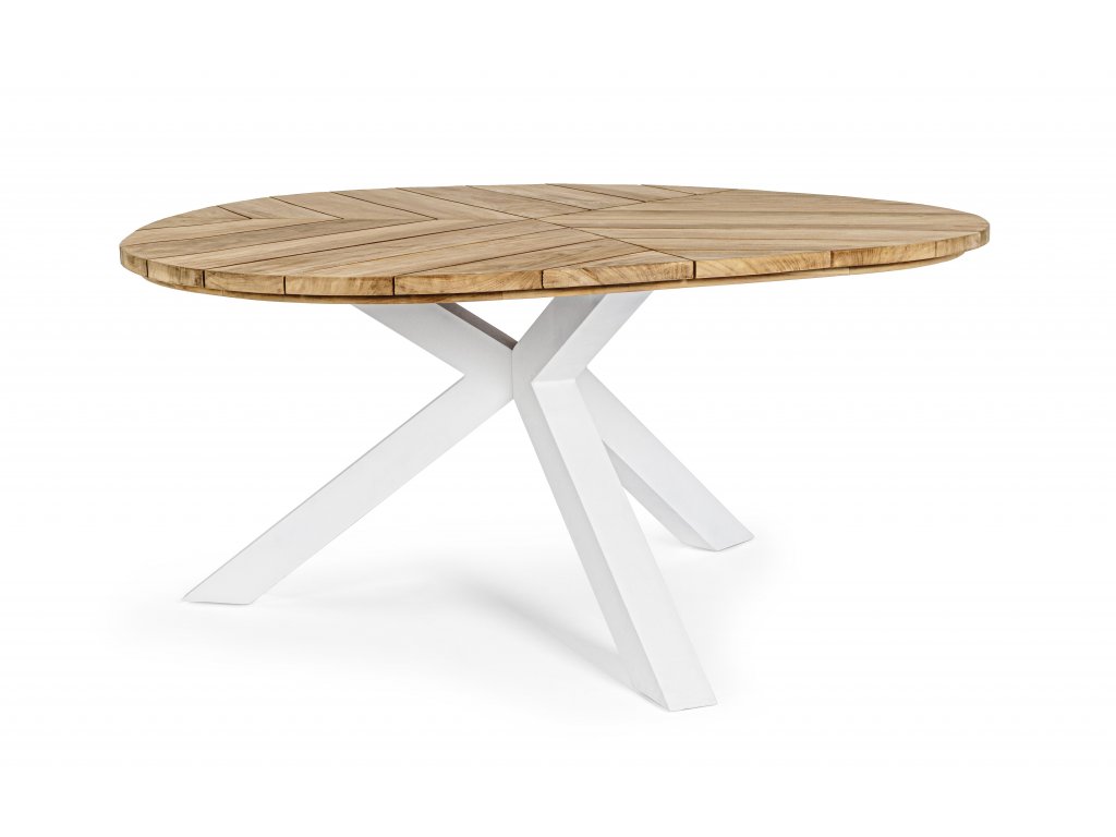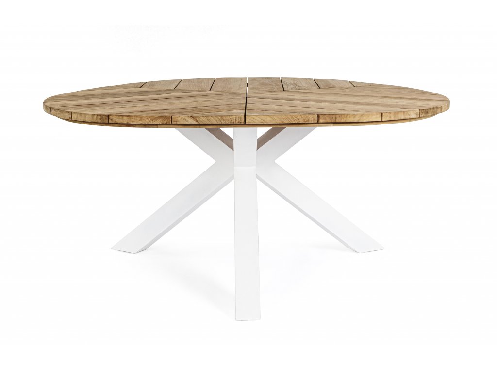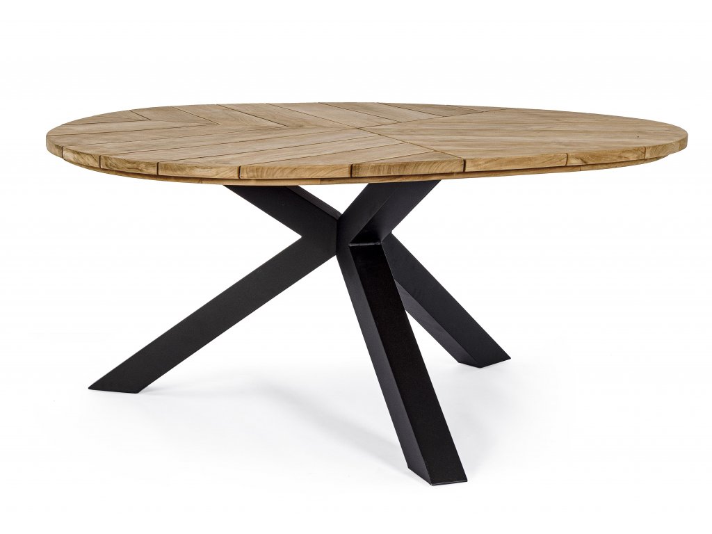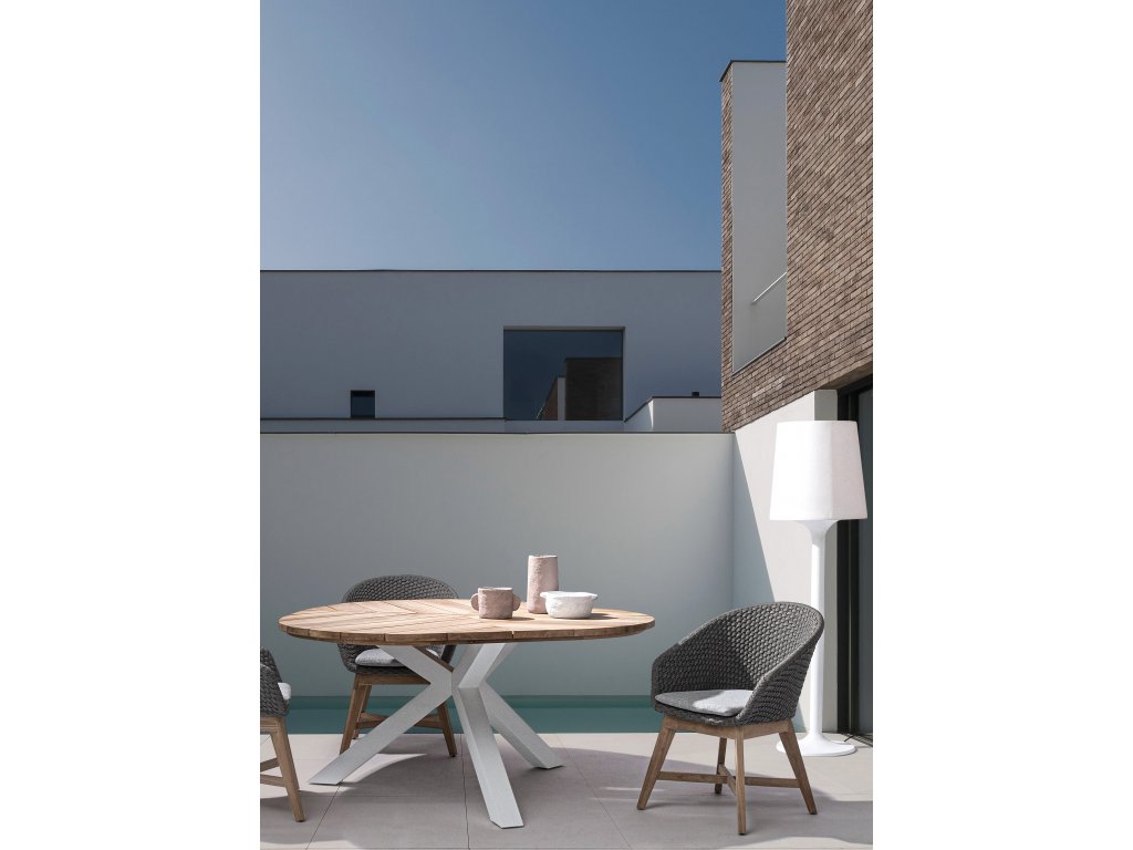 Vnější jídelní stůl z kolekce nábytku PALMDALE. Stolová deska unikátního trojúhelníkového tvaru s oblými hranami je vyrobena z kvalitního masivního