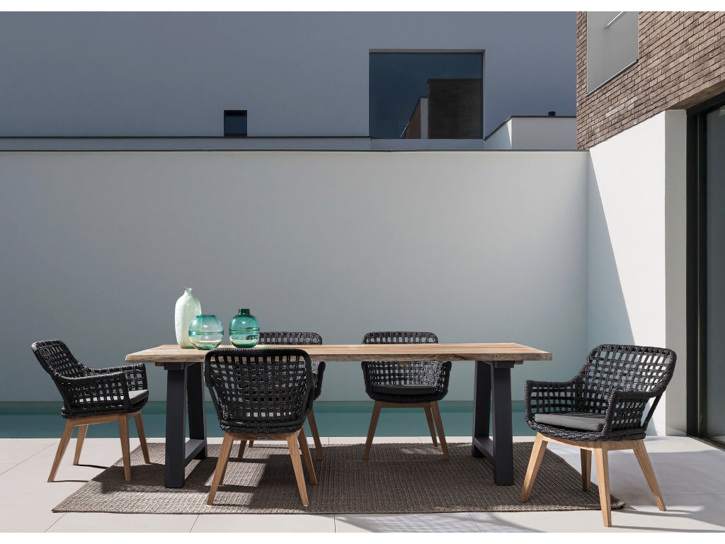 Masivní designový jídelní stůl z kolekce venkovního nábytku ROLLAND. Stolní masivní deska je vyrobena z kulatiny přírodního indonéského dřeva. Podnož stolu je vyrobena z hliníku s nástřikem v barvě antracitu. Stůl nabízí sezení pro 10 osob.