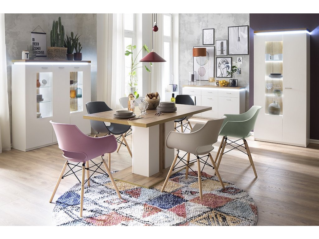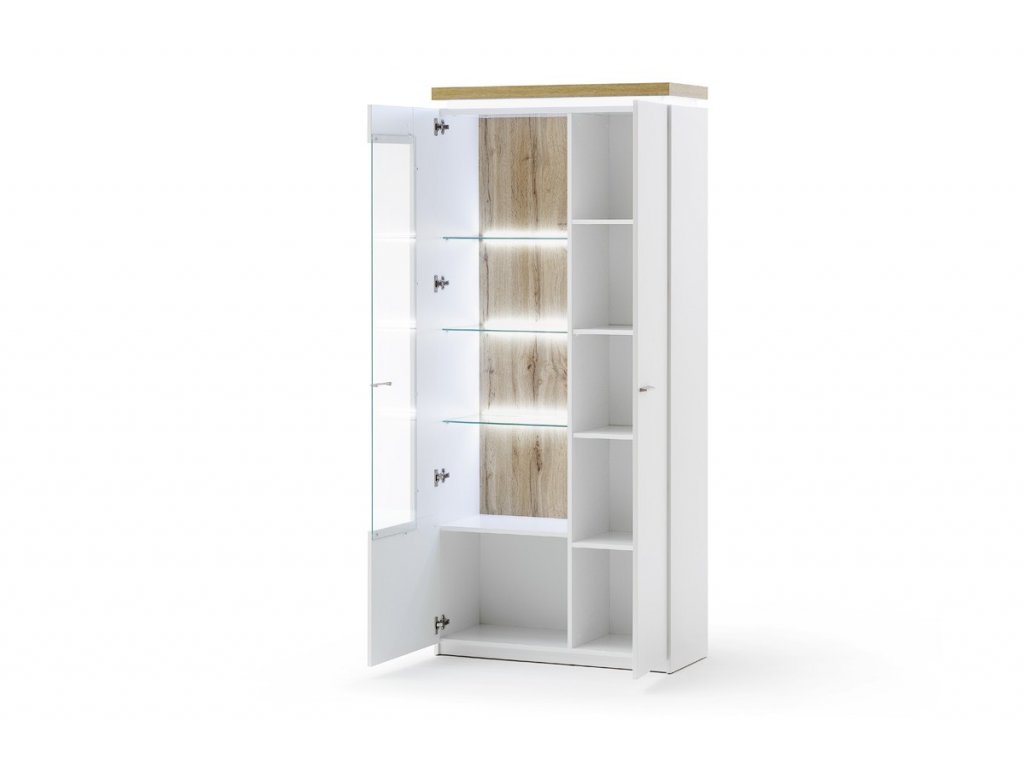 Vitrína z designové kolekce nábytku „CALI“. Styl této vitríny se vyznačuje hlavně kombinací bílé repliky melaminu a repliky dubového melaminu. Vitrína je doplněna o LED osvětlení vrchního panelu a skleněné poličky, u kterých si můžete zvolit osvětlení - bílé LED osvětlení zadní stěny. (příplatková funkce).
