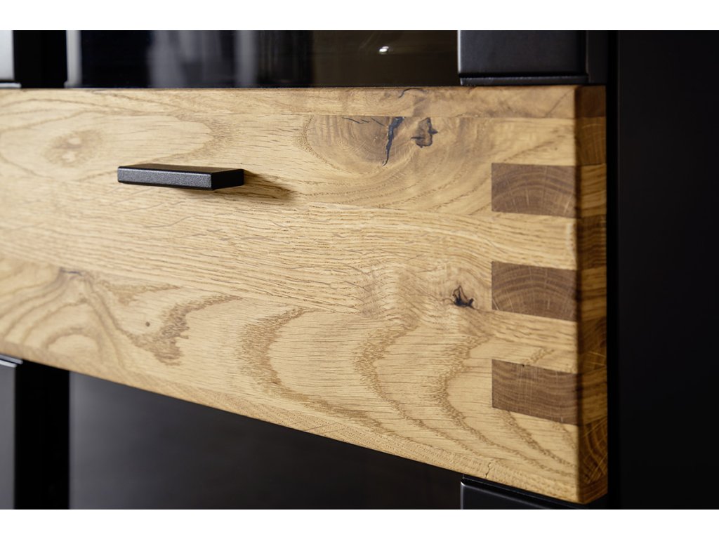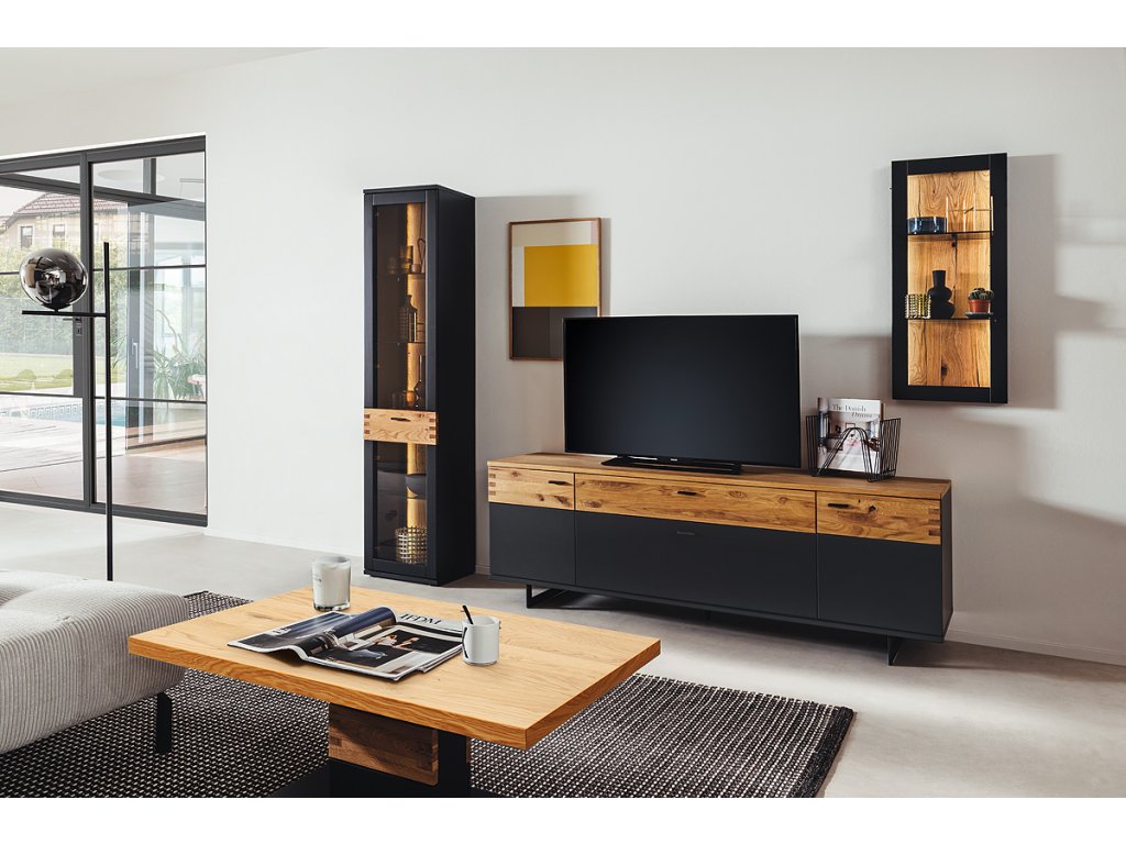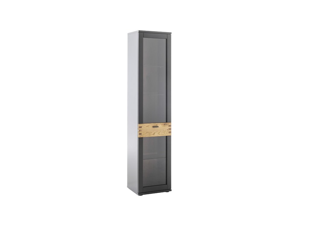 Chcete do svého obývacího pokoje vnést harmonii? S moderními obývacími vitrínami z kolekce Cesena můžete svému interiéru dodat jedinečný charakter. Elegance v matném černošedém provedení bude v této sezóně hitem. Prvek z olejovaného dubu jen podtrhne výjimečnost. Kombinace, která je nejen moderní, ale také funkční, což je jedna z hlavních výhod této luxusní vitríny. Prosklená část se skleněnými poličkami se stane vaší výkladní skříní. Dokonce se může i rozzářit, pokud si zvolíte doplňkové osvětlení. Kovový úchyt skříňky černošedé barvy.