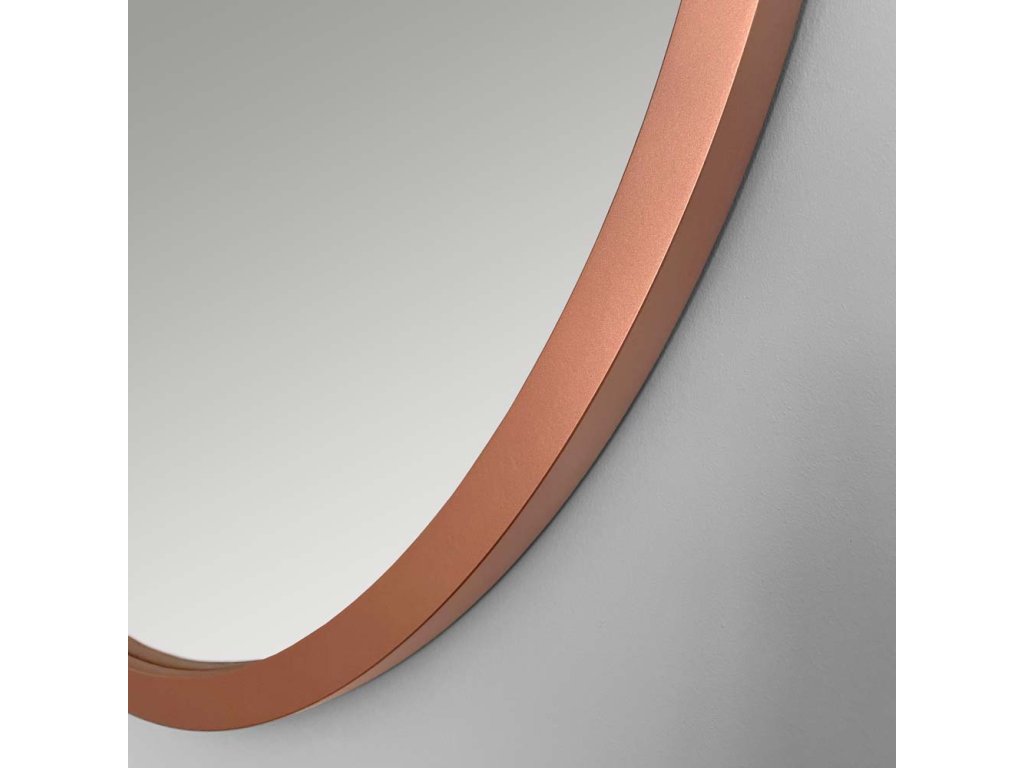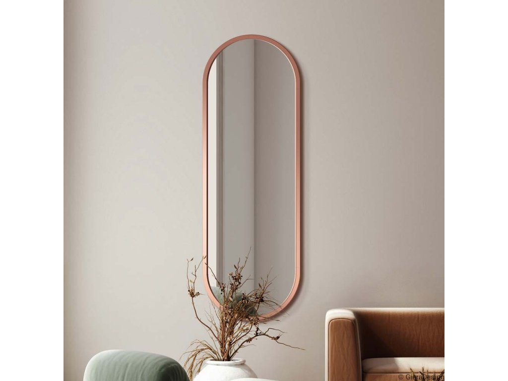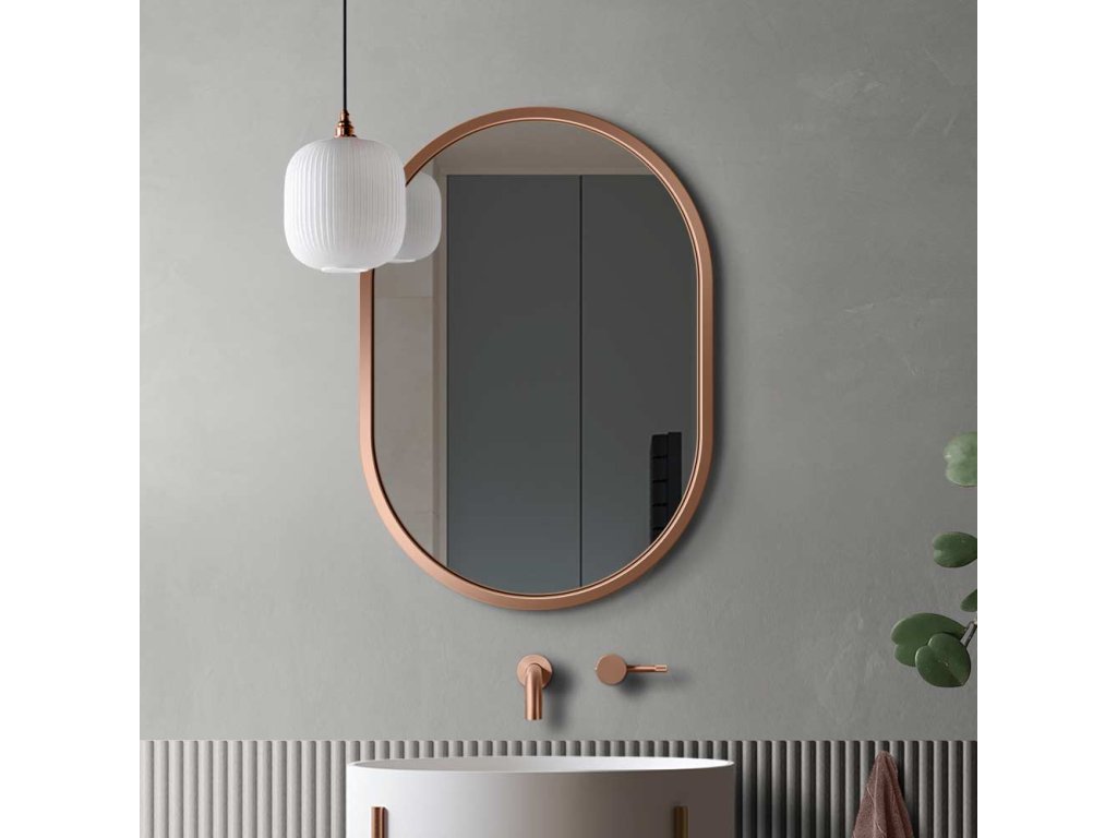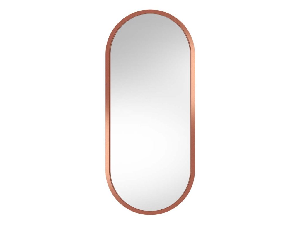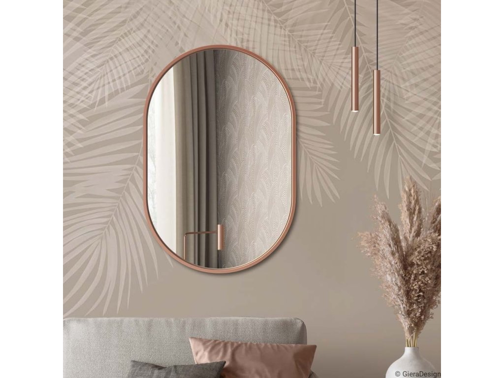 Nádherné nástěnné zrcadlo v oválném provedení s rámem v měděné barvě. Dokonale se hodí do interiérů v eklektickém, skandinávském nebo moderním stylu. Rám zrcadla je vyroben z voděodolné MDF lakované tvrdým dvousložkovým polyuretanovým lakem. Vysoce lesklé zrcadlo s leštěnými hranami je zajištěno vrstvou teflonu, která jej chrání před korozivními účinky vlhkosti - vhodné i do koupelny.