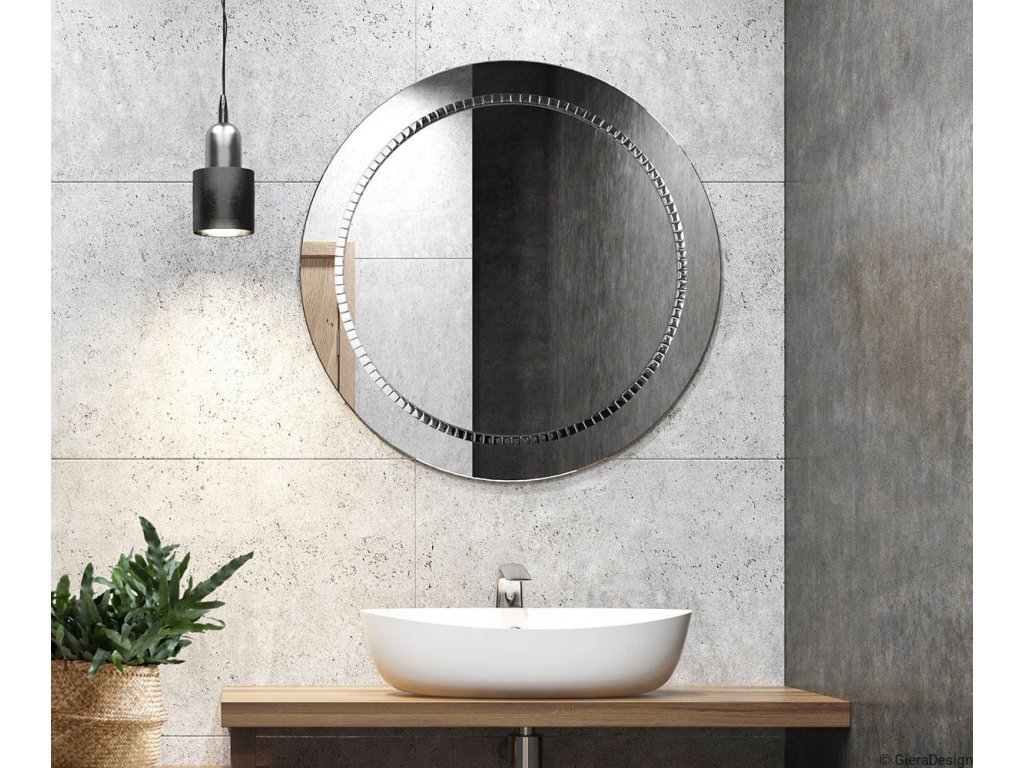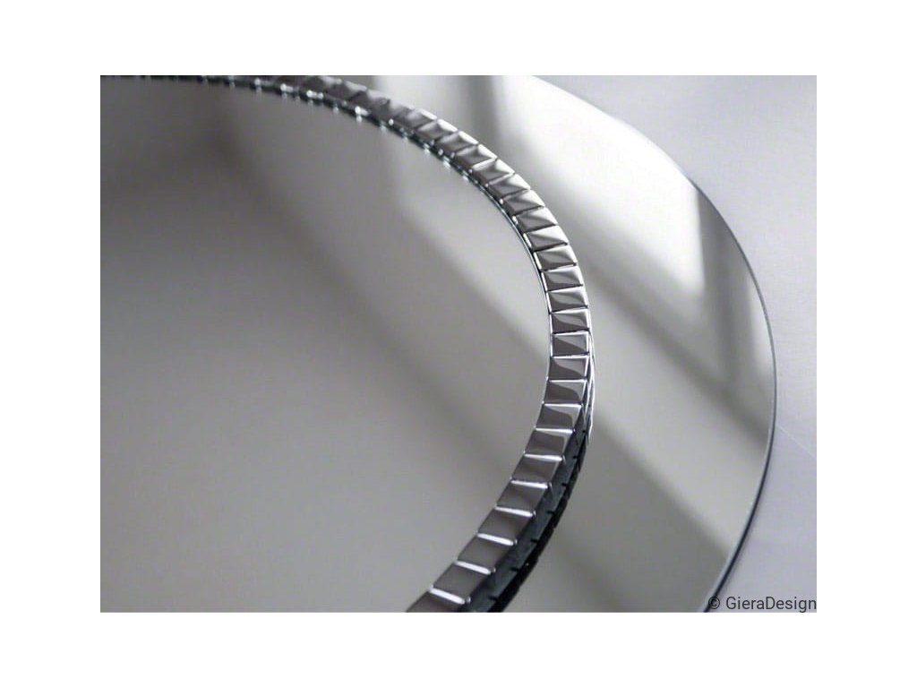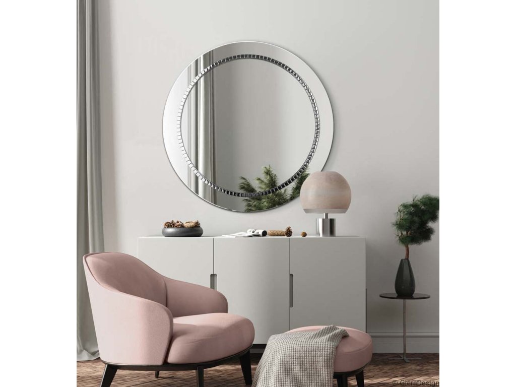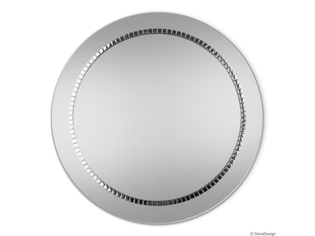 Elegantní kulaté nástěnné zrcadlo v zrcadlovém rámu zdobeném skleněnou mozaikou. Tato klasika je vhodná nejen do koupelny, ale i do obývacího pokoje, ložnice nebo předsíně. Vynikne v klasických i v glamour interiérech. Rám je vyroben ze zrcadla a vysoce kvalitní mozaiky ze stříbrného skla (jedna kostka 15 × 15 mm). Háčky jsou namontovány na zadní straně pro vertikální nebo horizontální instalaci. Na požádání může být zrcadlo upravené bez háčků. Zrcadlo se zhotovuje na zakázku, je možné vyrobit i jiný rozměr.