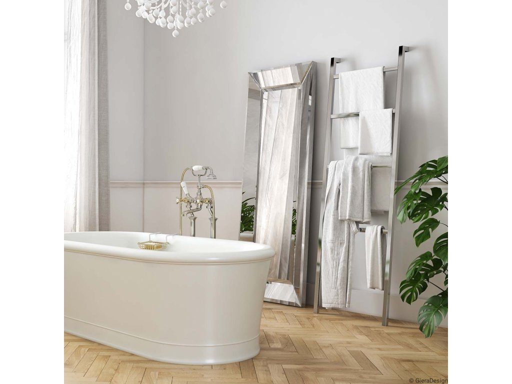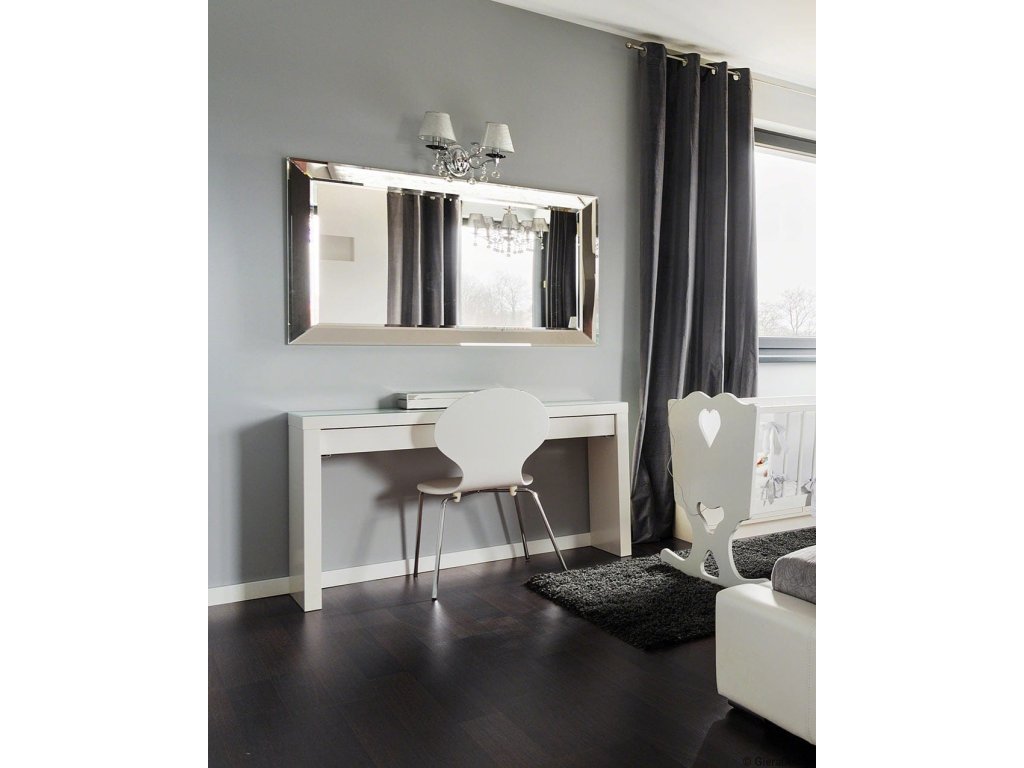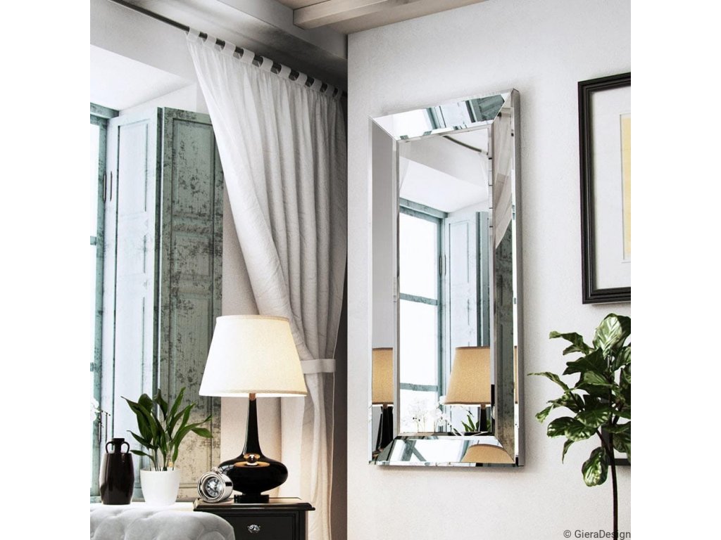 Nádherné obdélníkové zrcadlo se zrcadlovým rámem má dokonalou povrchovou úpravu a nádherné odlesky vytvářené světlem. Rám zrcadla s mírně skloněnými stranami krásné rozptyluje světlo a těší se z množství odrazů. Rám zrcadla je mírně zvednutý pod úhlem (o 5 cm), zrcadlo disponuje fazetou 1,5 cm. Boky zrcadla jsou zrcadlové. Vzadu jsou v desce jsou zapuštěny věšáky, díky kterým zrcadlo neodstává od stěny.