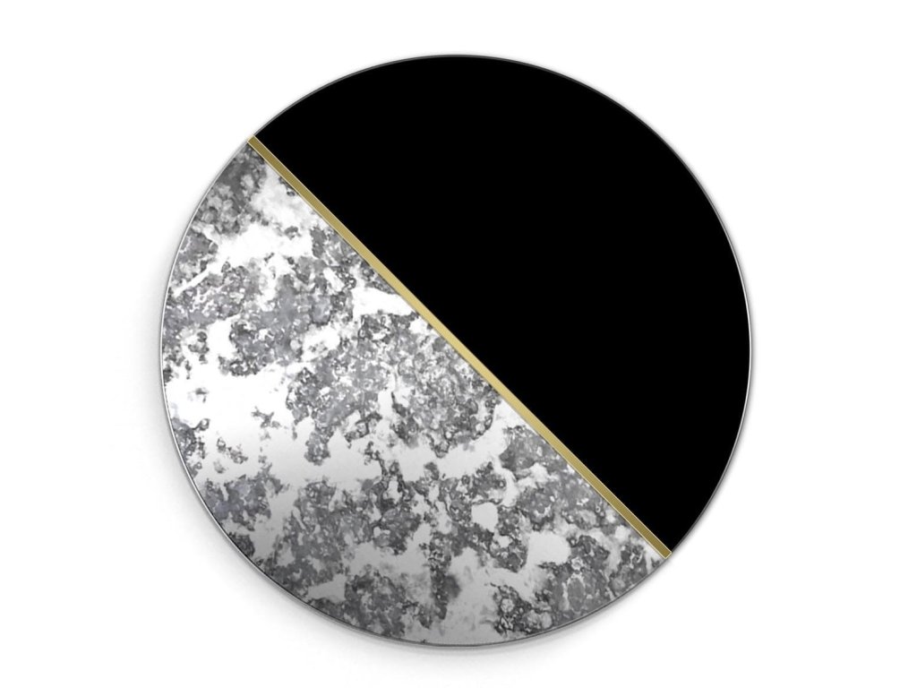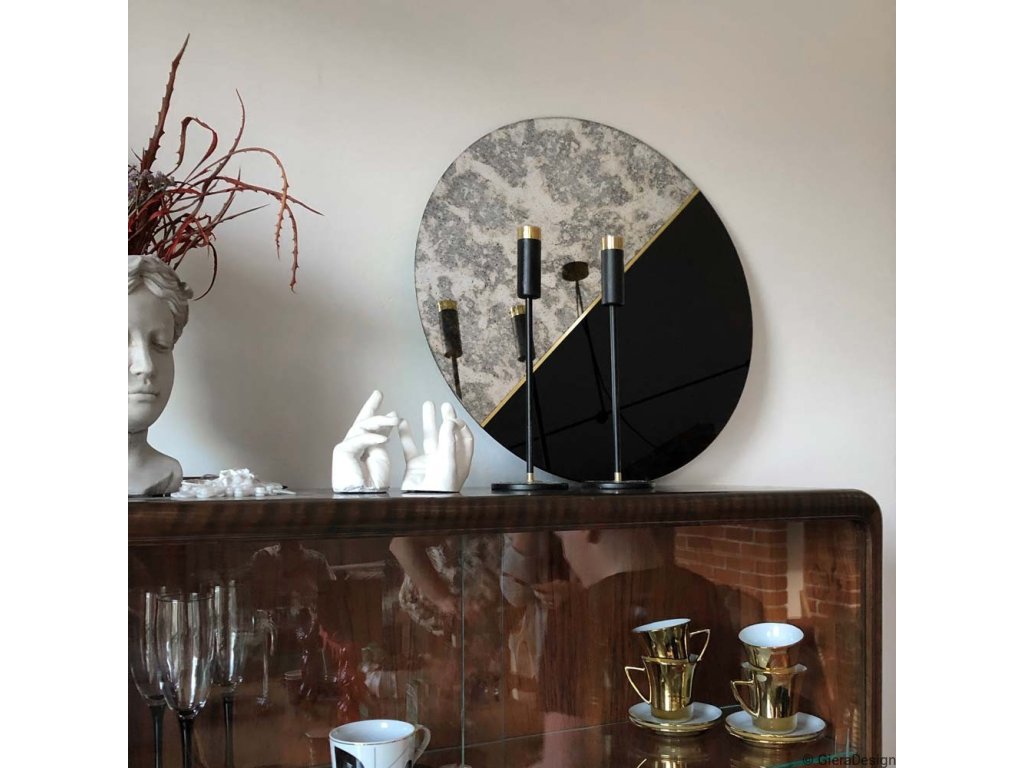 Originální zrcadlová dekorace ze starožitného zrcadla s přídavkem mosazi. Zrcadlo je vyrobeno z kombinace starožitného zrcadla s černým lacobelom. Je vyrobeno z kombinace starožitného zrcadla s černým lacobelom. Tyto dva prvky spojuje úzký pásek z leštěné mosazi, který mu dodává noblesu a eleganci. Zrcadlo bude krásnou dekorací do obývacího pokoje, haly nebo jídelny, skvěle bude vypadat jako dekorace nad komodou. Zrcadlo se zhotovuje na zakázku, je možné vyrobit i jiný rozměr. Zrcadla jsou vyrobeny z těch nejkvalitnějších belgických zrcadel s vysokou propustností a leskem. Broušení a leštění hran je prováděno na kvalitních italských strojích pro zpracování skla. Zrcadlo má háčky na zadní straně.Diskuze