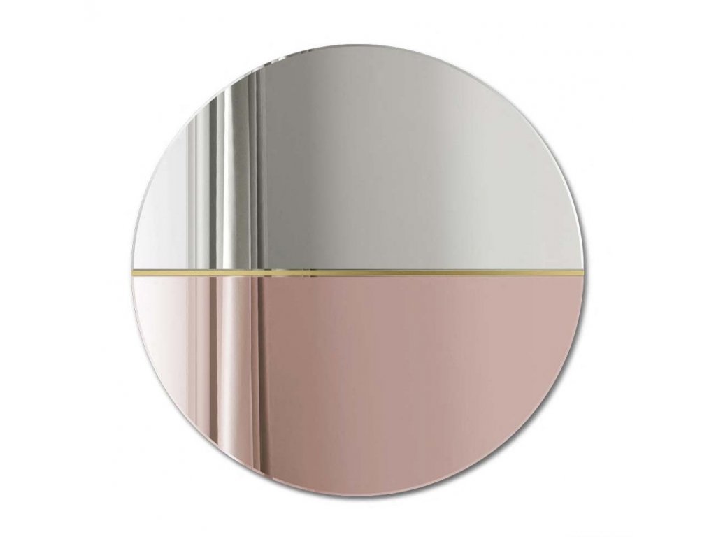Originální dvoubarevné dekorativní zrcadlo vyrobené z klasického a měděného zrcadlového skla. Tyto dva prvky jsou spojeny úzkou lištou z leštěné mosazi, která dodává zrakdlu styl a eleganci. Na jedné polovině bylo použito zrcátko s měděným stínem, také nazývané růžové zlato, které dokonale zapadá do současných trendů interiéru. Toto kulaté bude poutavou ozdobou moderní obývacího pokoje, ložnice nebo jídelny. Je k dispozici ve více barevných provedeních. Zrcadlo se zhotovuje na zakázku, je možné vyrobit i jiný rozměr. Zrcadla jsou vyrobeny z těch nejkvalitnějších belgických zrcadel s vysokou propustností a leskem. Broušení a leštění hran je prováděno na kvalitních italských strojích pro zpracování skla. Zrcadlo má háčky na zadní straně.Doplňkové parametry
