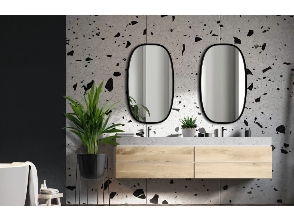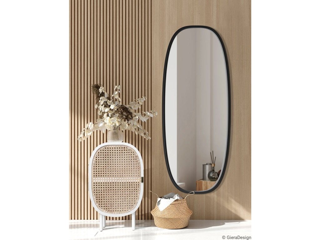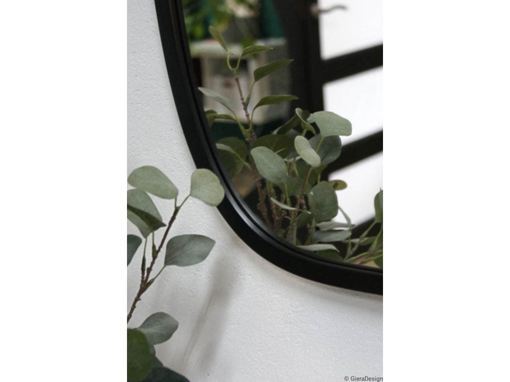 Dekorativní oválné zrcadlo v černém rámu dokonale doplňuje moderní interiéry, perfektně ladí s módními materiály jako je beton nebo dřevo. Tento model bude vypadat skvěle jako v koupelně, tak v ložnici, šatníku nebo obývacím pokoji. Rám je vyroben z vodotěsné MDF desky lakované tvrdým dvousložkovým polyuretanovým lakem, metalickým. Zrcadlo je dodatečně zajištěno ze zadní strany výztužnou fólií, která zvyšuje pevnost zrcadla a v případě jeho rozbití zachovává své kusy v rámu. Zrcadlo s vysokým leskem a leštěnými hranami. Na zadní straně úchyty.