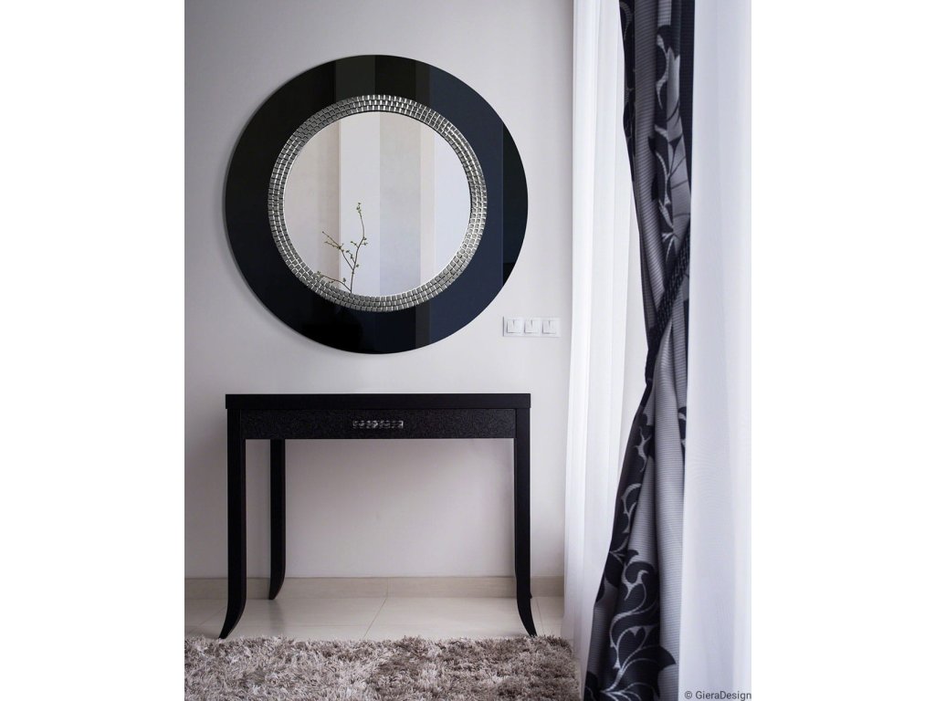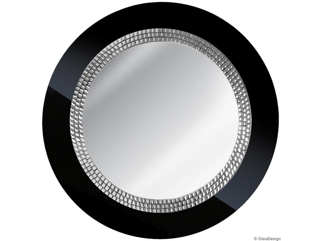 Elegantní, kulaté nástěnné zrcadlo v černém rámu zdobené stříbrnou mozaikou. Nadčasový design odkazující na styl Art Deco. Perfektně se hodí do obývacího pokoje, jídelny nebo ložnice. Zrcadlo je zajištěno teflonem, který ho chrání před korozivním účinkem vlhkosti - vhodné i do koupelny. Zbroušené a leštěné okraje zrcadla jsou samozřejmostí. Rám zrcadla je vyroben z černého skla Lacobel a kvalitní skleněné stříbrné mozaiky (tři řady kostek 15 x 15 mm). Na ni je nalepeno leštěné zrcadlo s vysokým leskem. Vzadu jsou namontovány věšáky, na přání může být bez věšáků, na lepení. Zrcadlo se zhotovuje na zakázku, je možné vyrobit i jiný rozměr. Zrcadla jsou vyrobeny z těch nejkvalitnějších belgických zrcadel s vysokou propustností a leskem. Broušení a leštění hran je prováděno na kvalitních italských strojích pro zpracování skla.