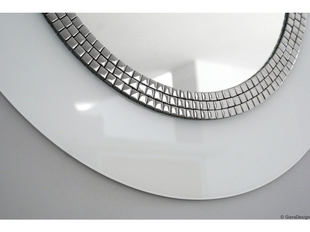 Elegantní, kulaté nástěnné zrcadlo v bílém rámu zdobené stříbrnou mozaikou. Nadčasový design odkazující na styl Art Deco. Perfektně se hodí do obývacího pokoje, jídelny nebo ložnice. Zrcadlo je zajištěno teflonem, který ho chrání před korozivním účinkem vlhkosti - vhodné i do koupelny. Zbroušené a leštěné okraje zrcadla jsou samozřejmostí. Rám zrcadla je vyroben z bílého skla Lacobel a kvalitní skleněné stříbrné mozaiky (tři řady kostek 15 x 15 mm). Na ni je nalepeno leštěné zrcadlo s vysokým leskem. Vzadu jsou namontovány věšáky, na přání může být bez věšáků, na lepení. Zrcadlo se zhotovuje na zakázku, je možné vyrobit i jiný rozměr. Zrcadla jsou vyrobeny z těch nejkvalitnějších belgických zrcadel s vysokou propustností a leskem. Broušení a leštění hran je prováděno na kvalitních italských strojích pro zpracování skla.Doplňkové parametry