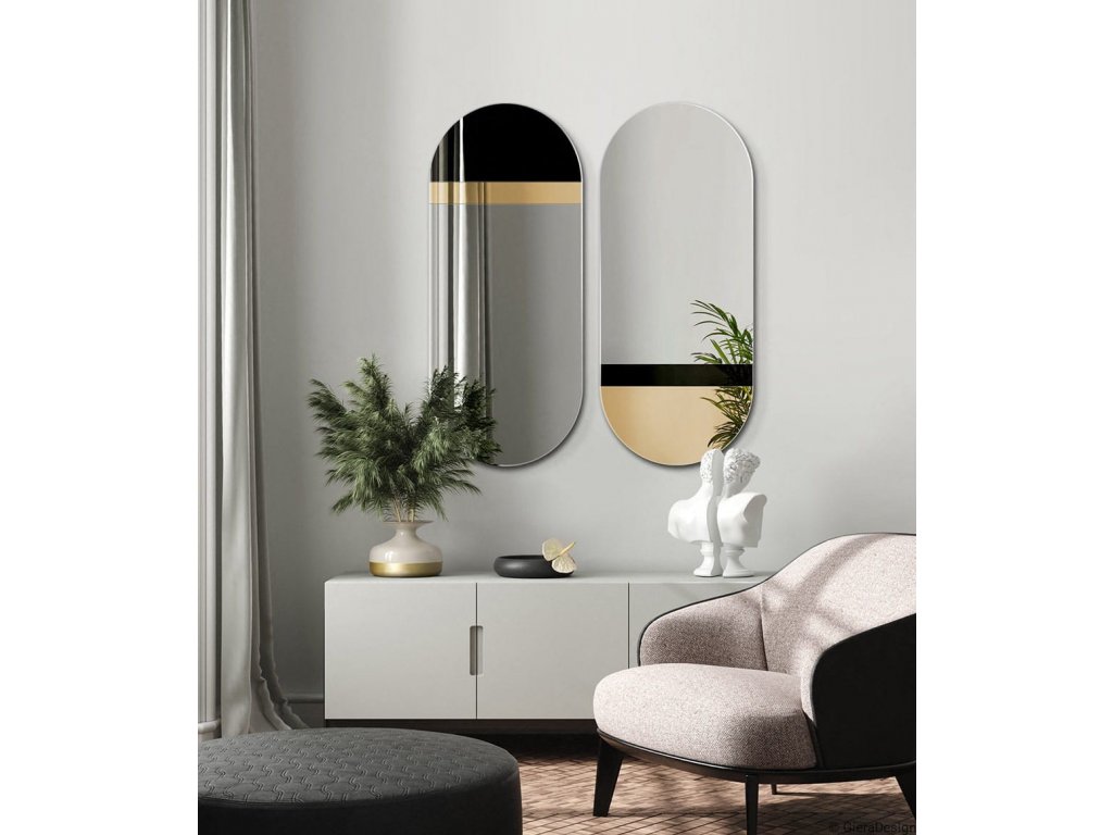 Originální zrcadlo v moderním stylu, inspirované grafikou 60. let, ozdobí moderní obývací pokoj, ložnici nebo předsíň jako umělecké dílo. Toto oválné zrcadlo je krásnou ozdobou moderního interiéru, je vynikající i pro moderní eklektické interiéry. Zrcadlo je kombinací tří různých prvků. Největší část tvoří zrcadlová plocha nejvyšší jakosti. Následuje proužek v zlaté barvě. Poslední část zrcadla zpestřuje plocha v černé barvě. Široký výběr variant v kolekci Fusion vám dává možnost vytvořit si vlastní barevné provedení - stačí nás kontaktovat pro podrobnější detaily. Zrcadlová plocha je pokryta teflonem. Ten ji chrání před korozními účinky vlhkosti, díky čemuž je zrcadlo vhodné i do koupelny. Zrcadlo se zhotovuje na zakázku, je možné vyrobit i jiný rozměr. Zrcadla jsou vyrobeny z těch nejkvalitnějších belgických zrcadel s vysokou propustností a leskem. Broušení a leštění hran je prováděno na kvalitních italských strojích pro zpracování skla.