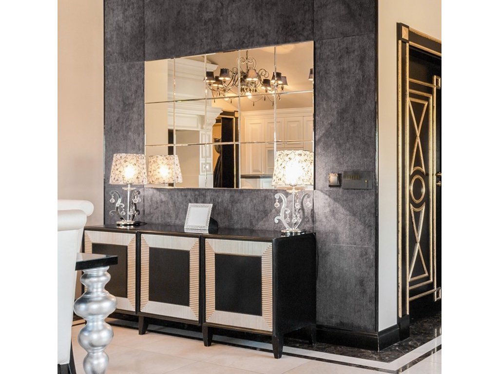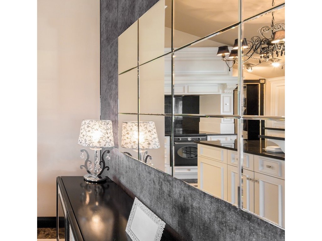 Elegantní zrcadlo ve stylu glamour. Skládá se z patnácti čtvercových tabulí, které jsou zkosené (1 cm) a přilepená na bílou nebo černou desku. Úchyty na zrcadle namontované na zadní straně pro vertikální nebo horizontální zavěšení jsou upevněny tak, aby zrcadlo nevystupovalo ze zdi. Ideální zrcadlo do obývacího pokoje, jídelny či ložnice. Díky němu se interiér stává ještě zajímavějším a opticky zvětšený. Zrcadlo je vyrobeno z nejkvalitnějších zrcadel Opti White. Je to velmi čisté super bílé zrcadlo s mnohem vyšší průhledností skla. Opti White zrcadla mají snížený obsah železa, což z velké části eliminuje typickou zelenou barvu skla. Opti White zrcadla jsou téměř bezbarvé, vyznačují se mnohem vyšším přenosem světla, zaručují věrnější reprodukci barev. Mají čistší a jasnější odraz. Zrcadlo je na objednávku. Zrcadla jsou vyrobeny z těch nejkvalitnějších belgických zrcadel s vysokou propustností a leskem. Broušení a leštění hran je prováděno na kvalitních italských strojích pro zpracování skla.Doplňkové parametry